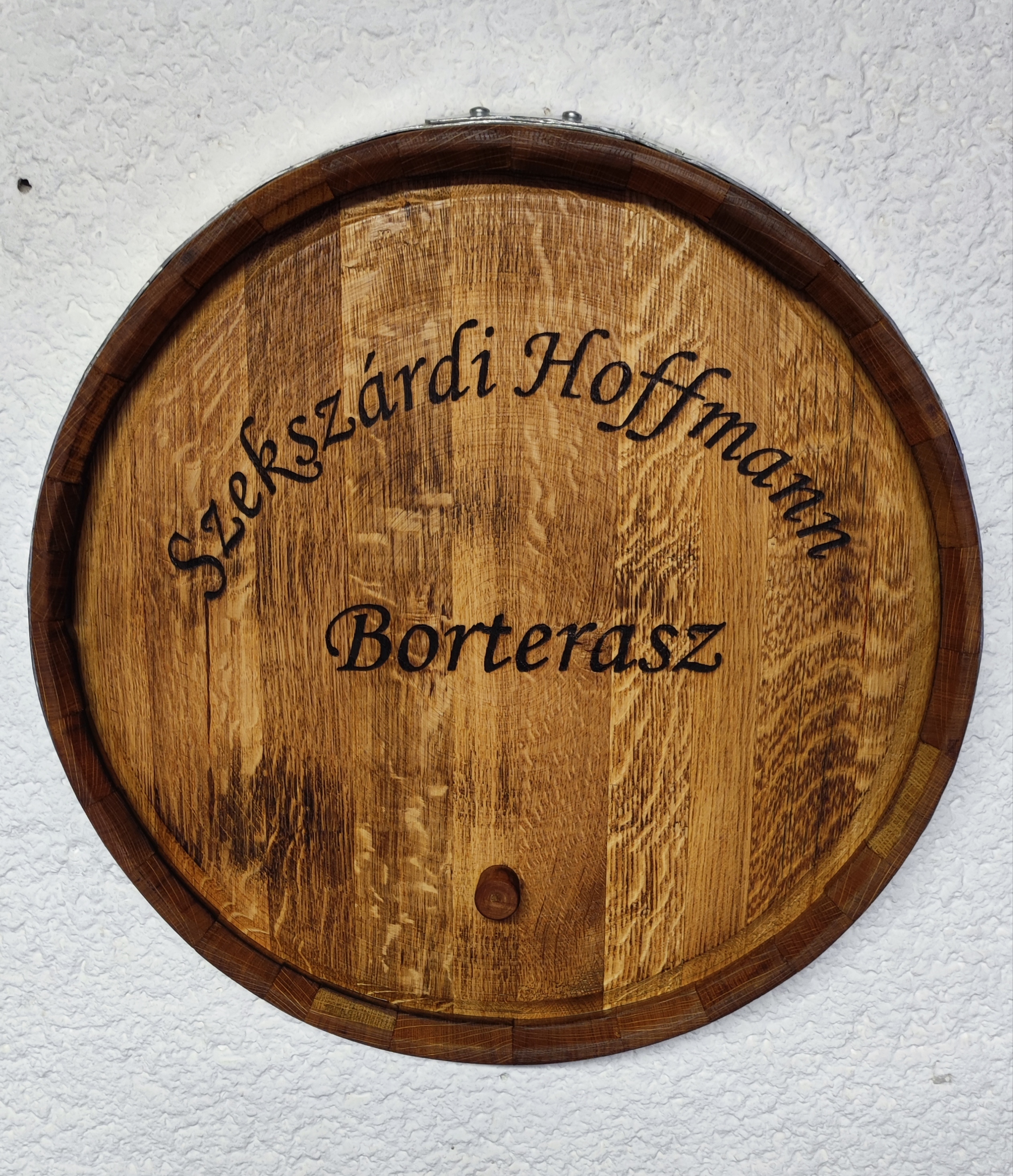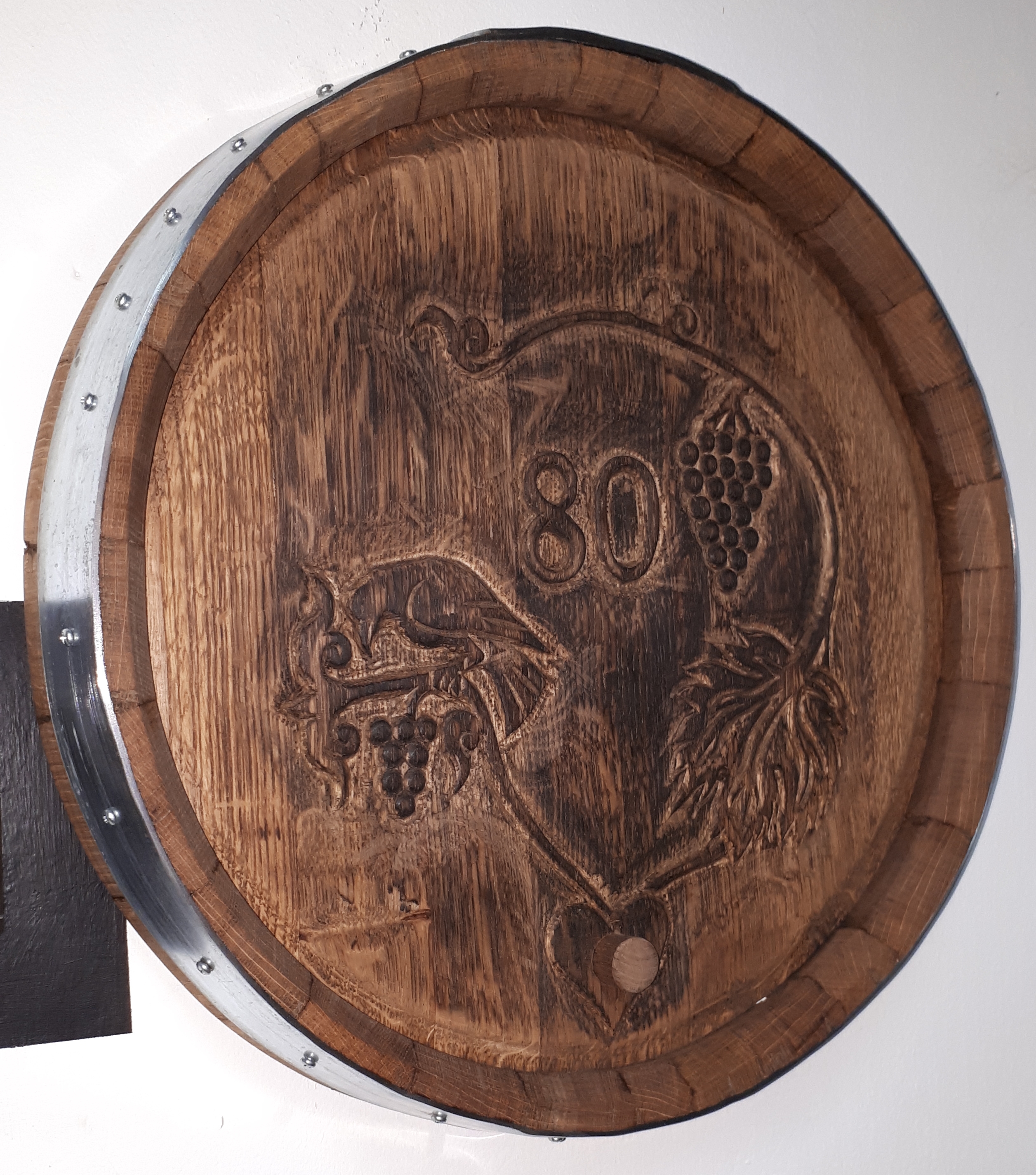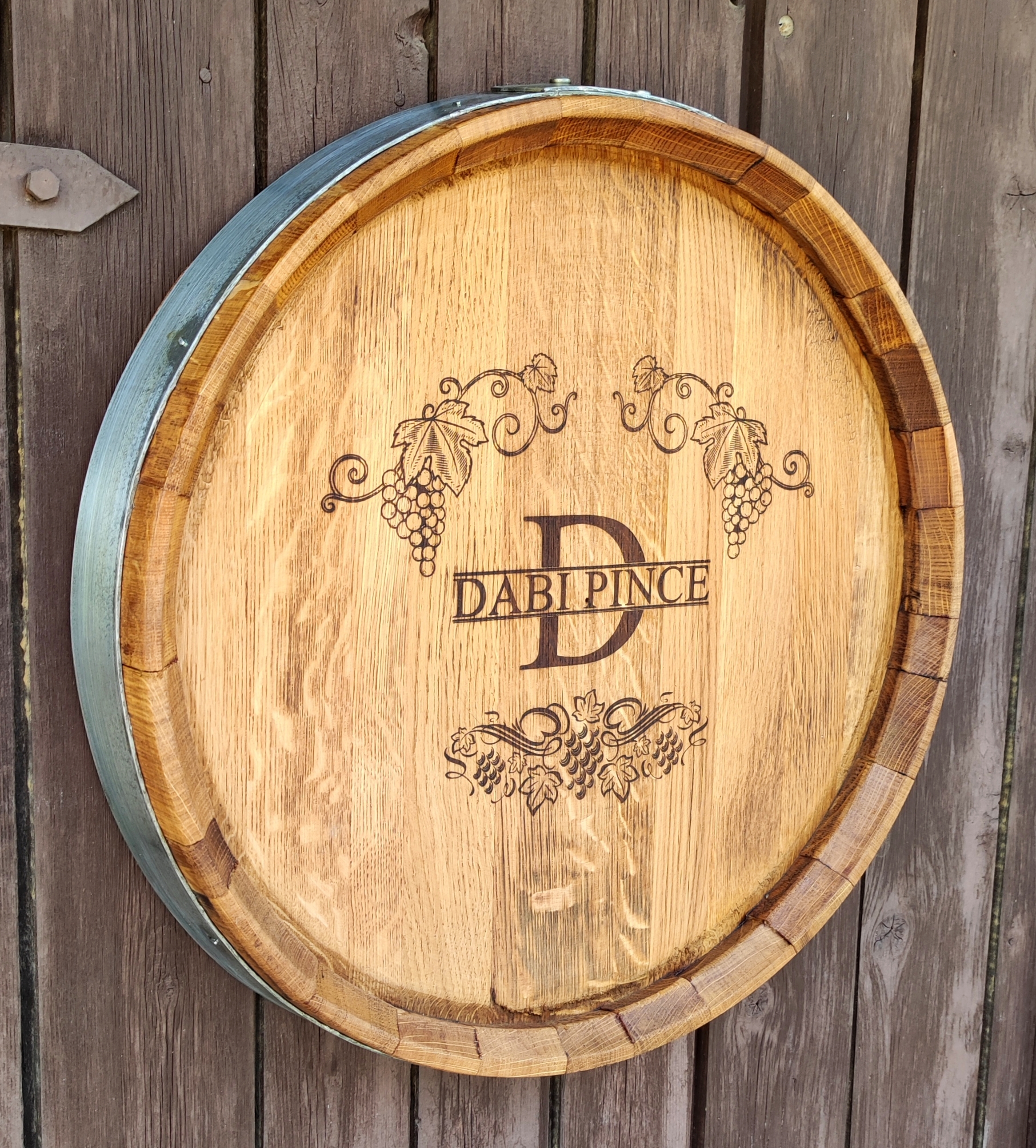 Szőlő motívumokkal díszített, egyedi felirattal ellátott lézergravírozott hordóvég, enyhe perzseléssel, teak olajjal felületkezelve