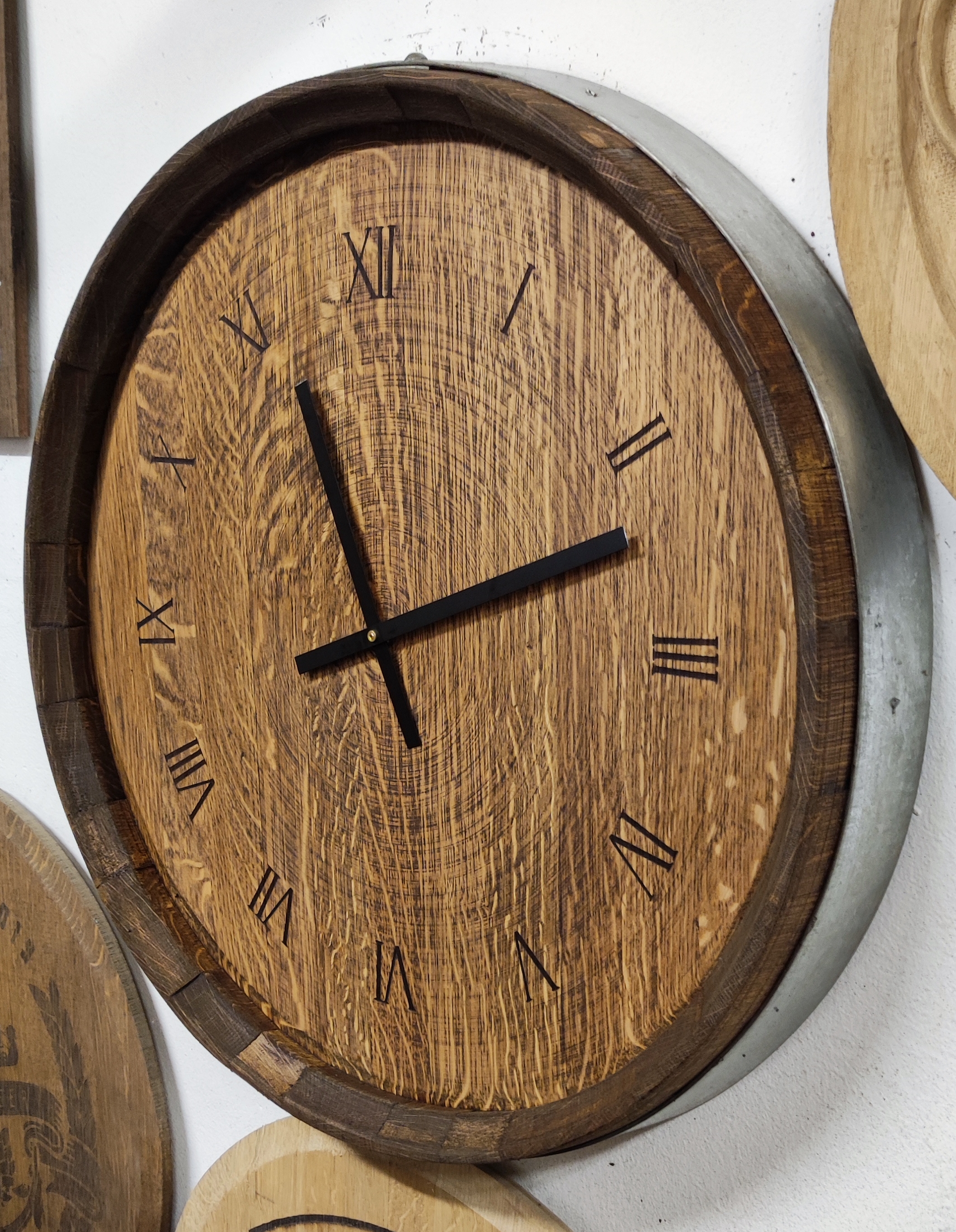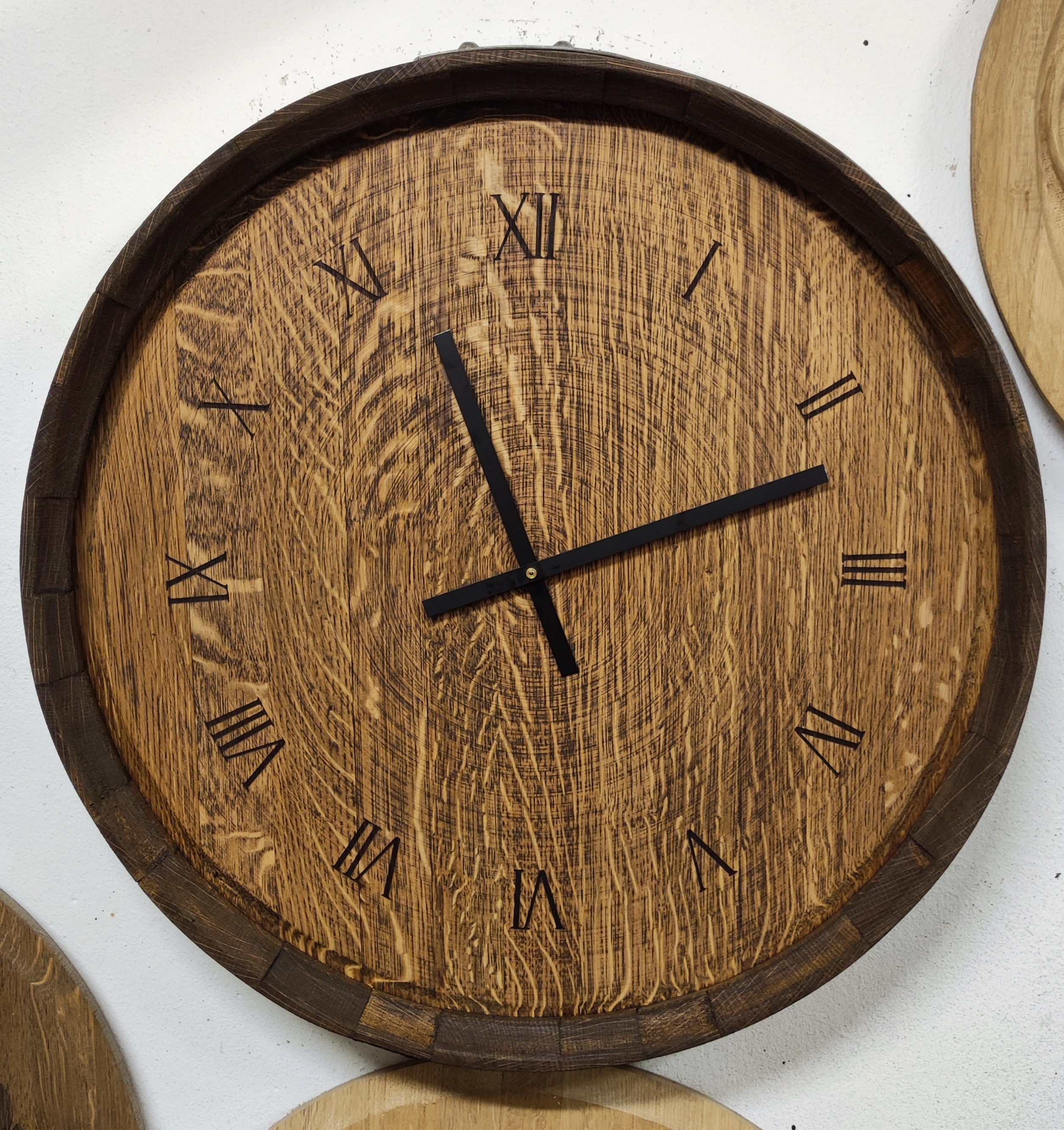 Kézzel faragott, festett és lézergravírozott tölgyfa fali dekoráció és falióra. Hordóvég vagy hordófenék egyedi díszítéssel.