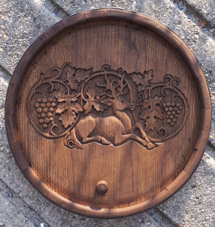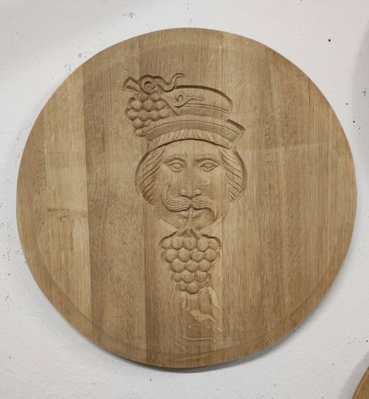 Kézzel faragott, festett és lézergravírozott tölgyfa fali dekoráció és falióra. Hordóvég vagy hordófenék egyedi díszítéssel.