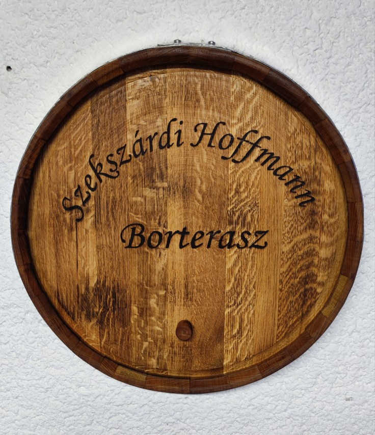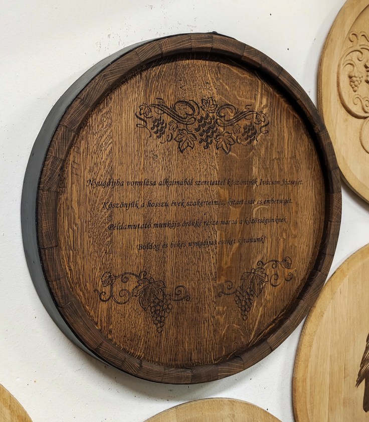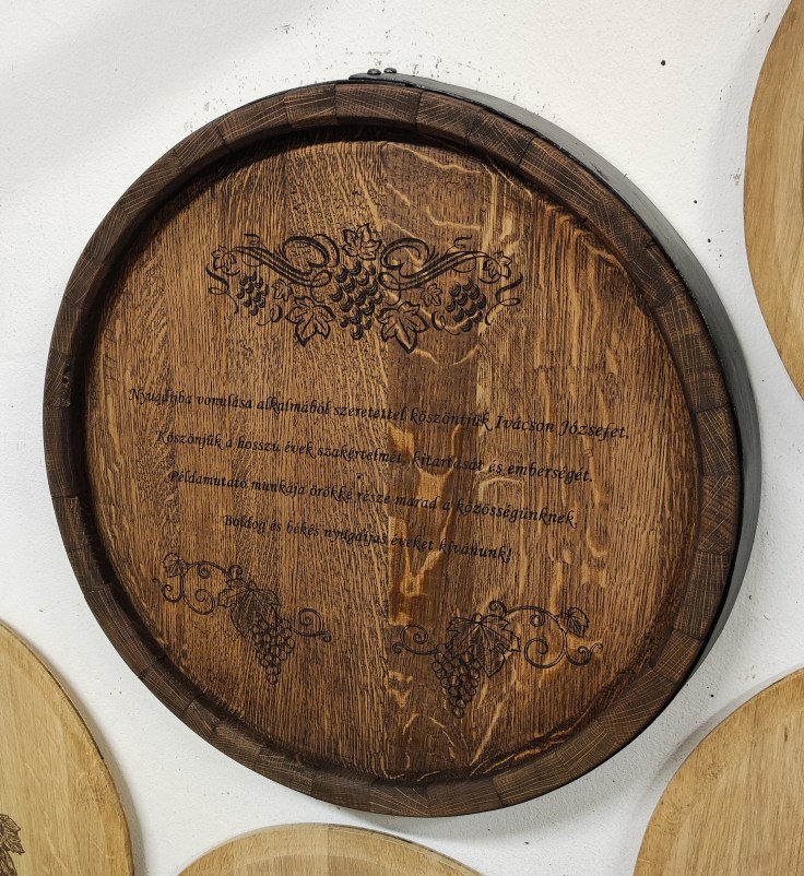 Szőlő motívumokkal díszített, egyedi felirattal ellátott lézergravírozott hordóvég, enyhe perzseléssel, teak olajjal felületkezelve