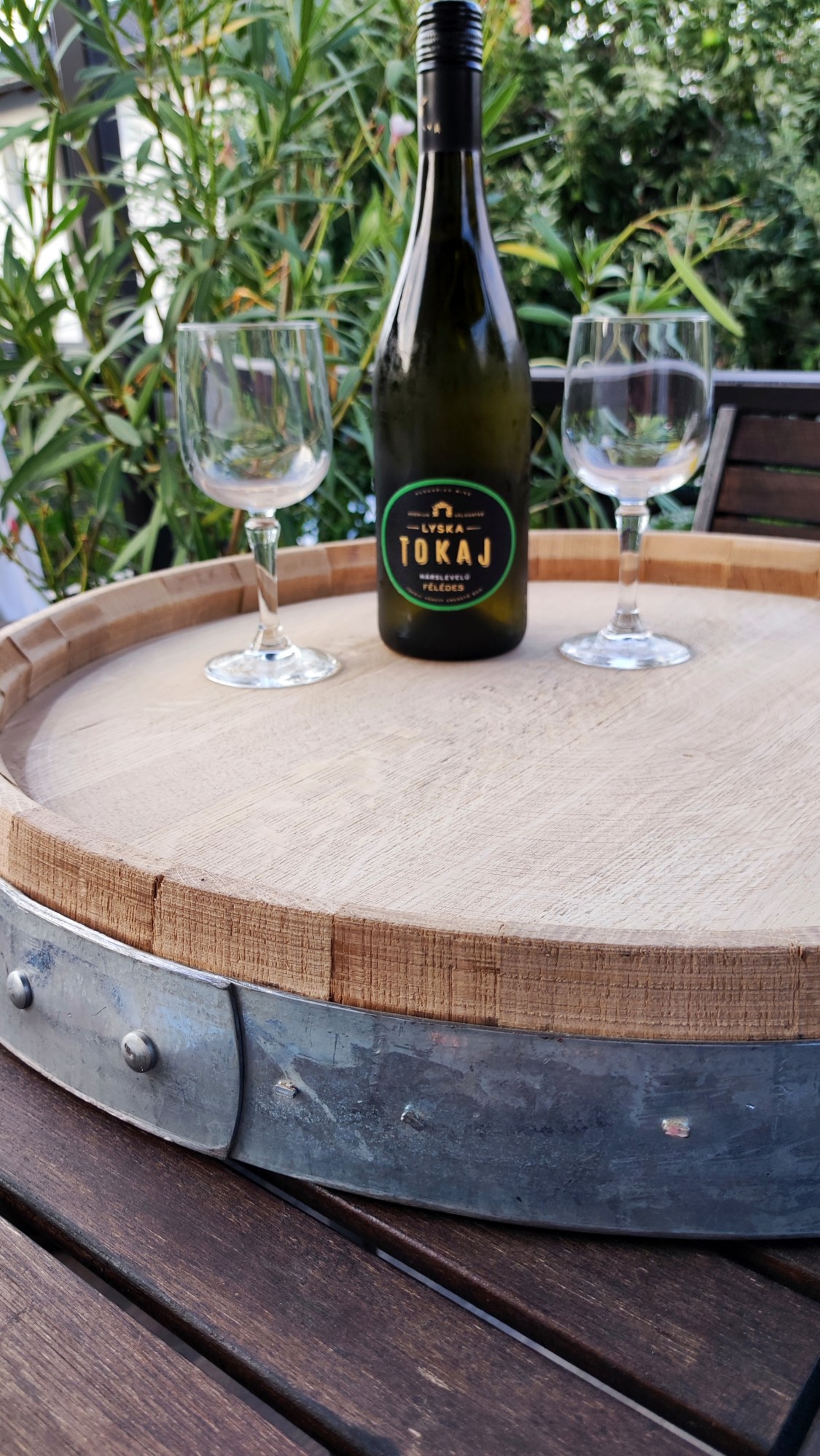 Szőlő motívumokkal díszített, egyedi felirattal ellátott, lézergravírozott hordóvég fekete abroncsokkal, paliszander lazúrral kezelve