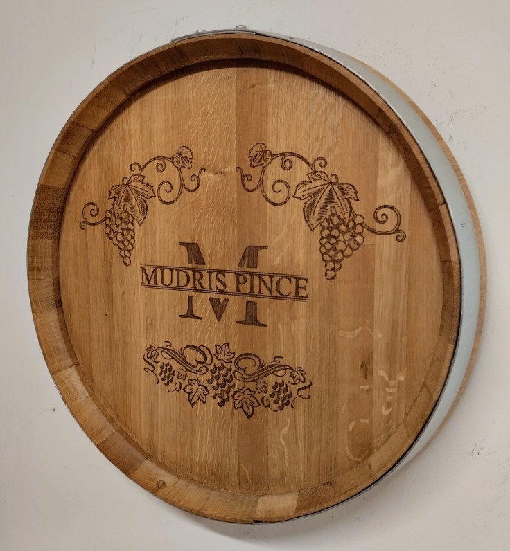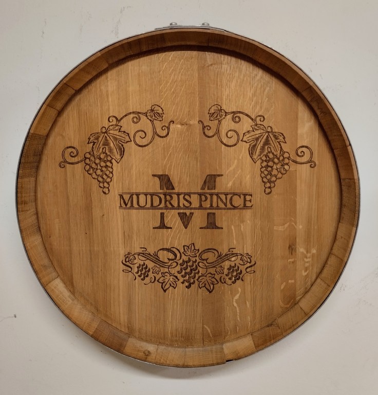 Szőlő motívumokkal díszített, egyedi felirattal ellátott lézergravírozott hordóvég, felületkezelés nélkül
