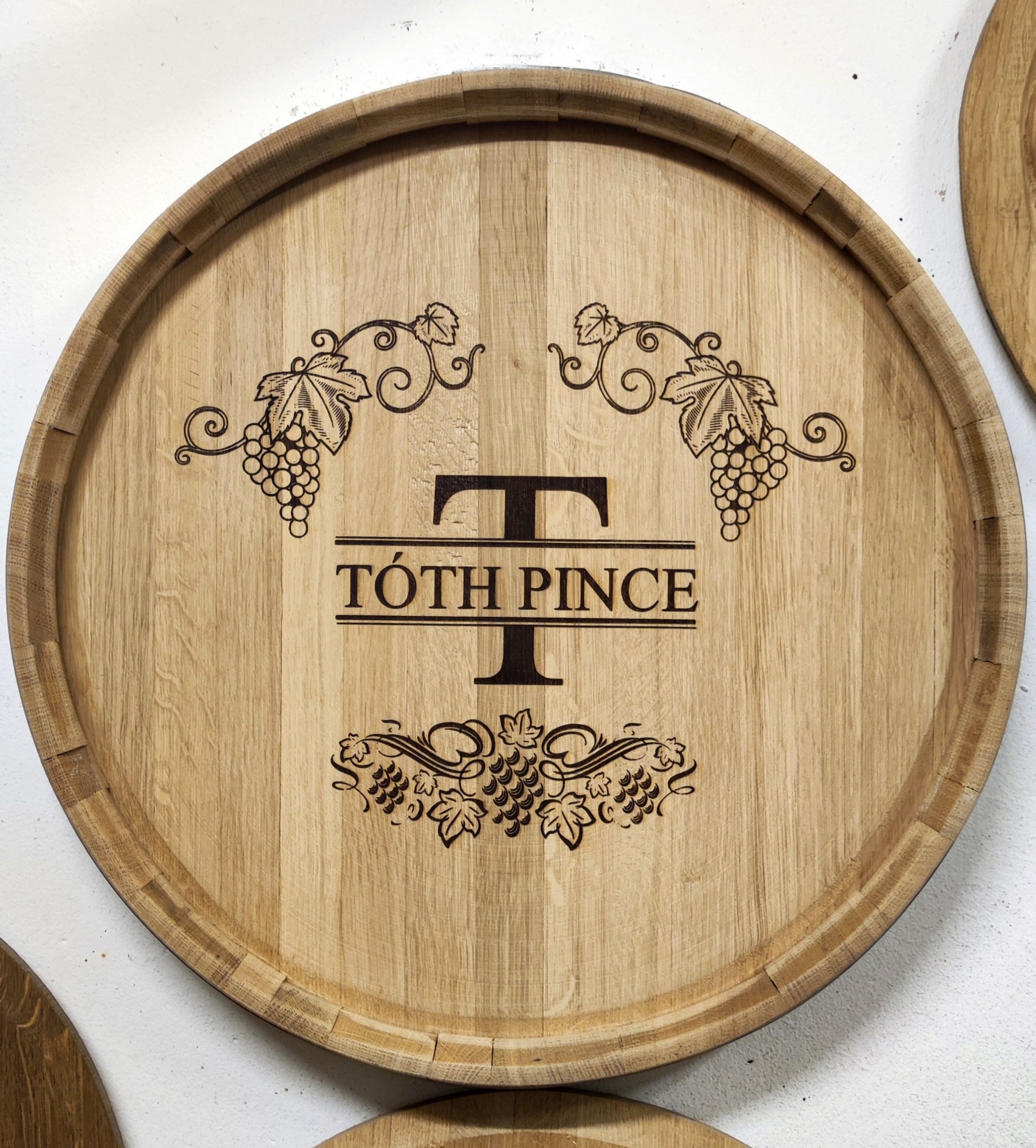 Szőlő motívumokkal díszített, egyedi felirattal ellátott lézergravírozott hordóvég, natúr