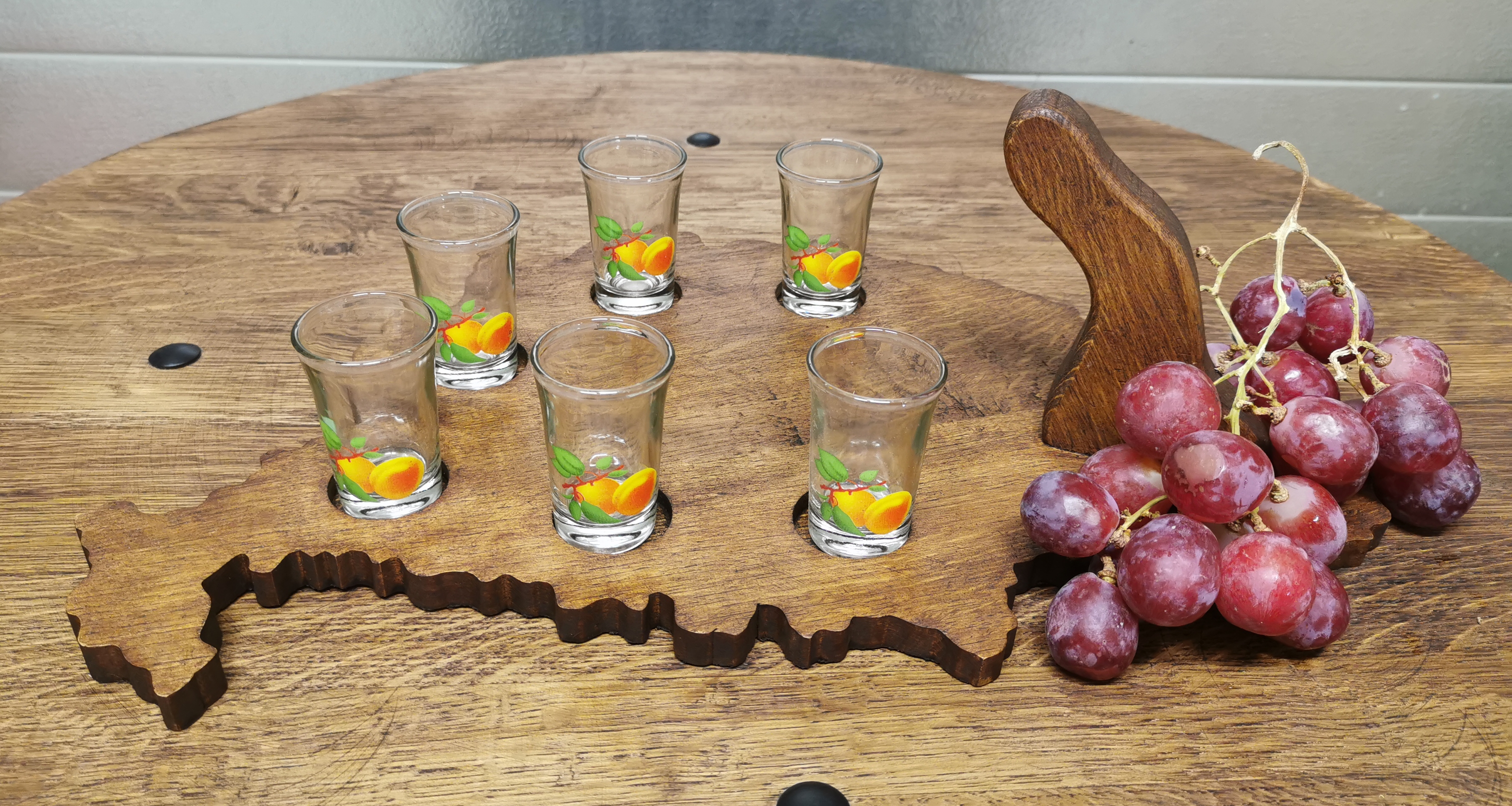 Tölgyfából készült pálinka kínáló 6 pohárral.