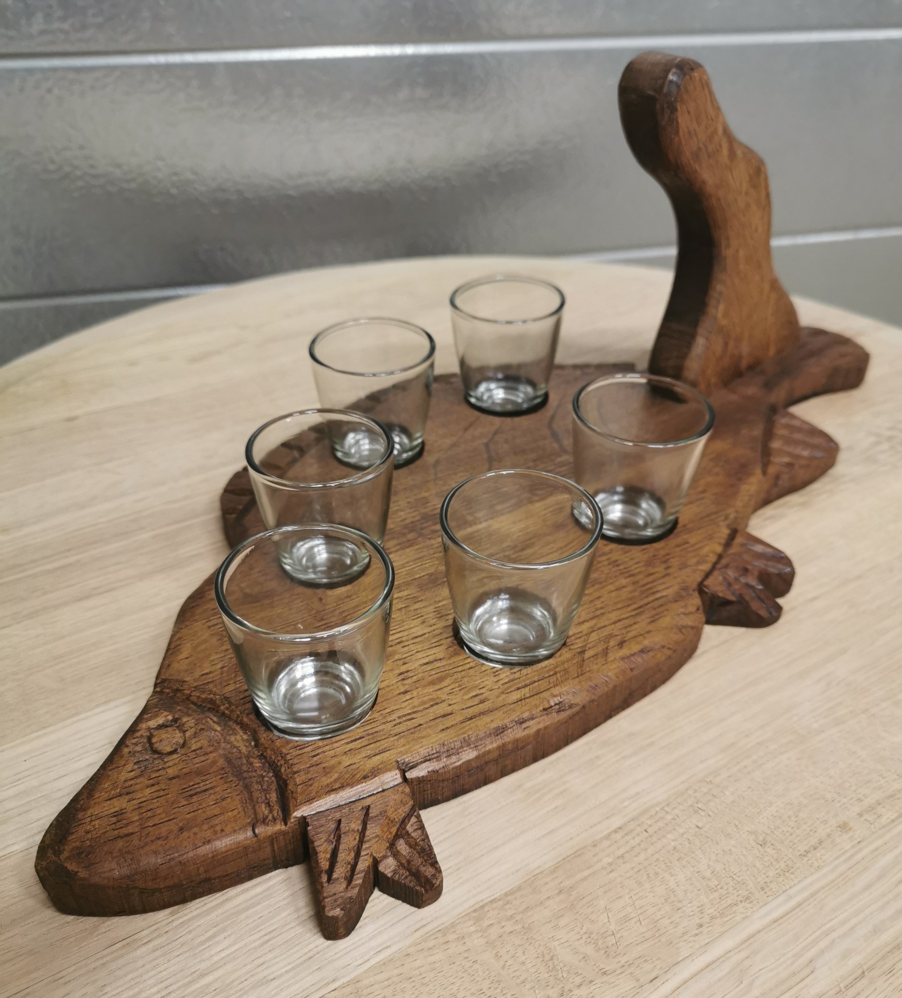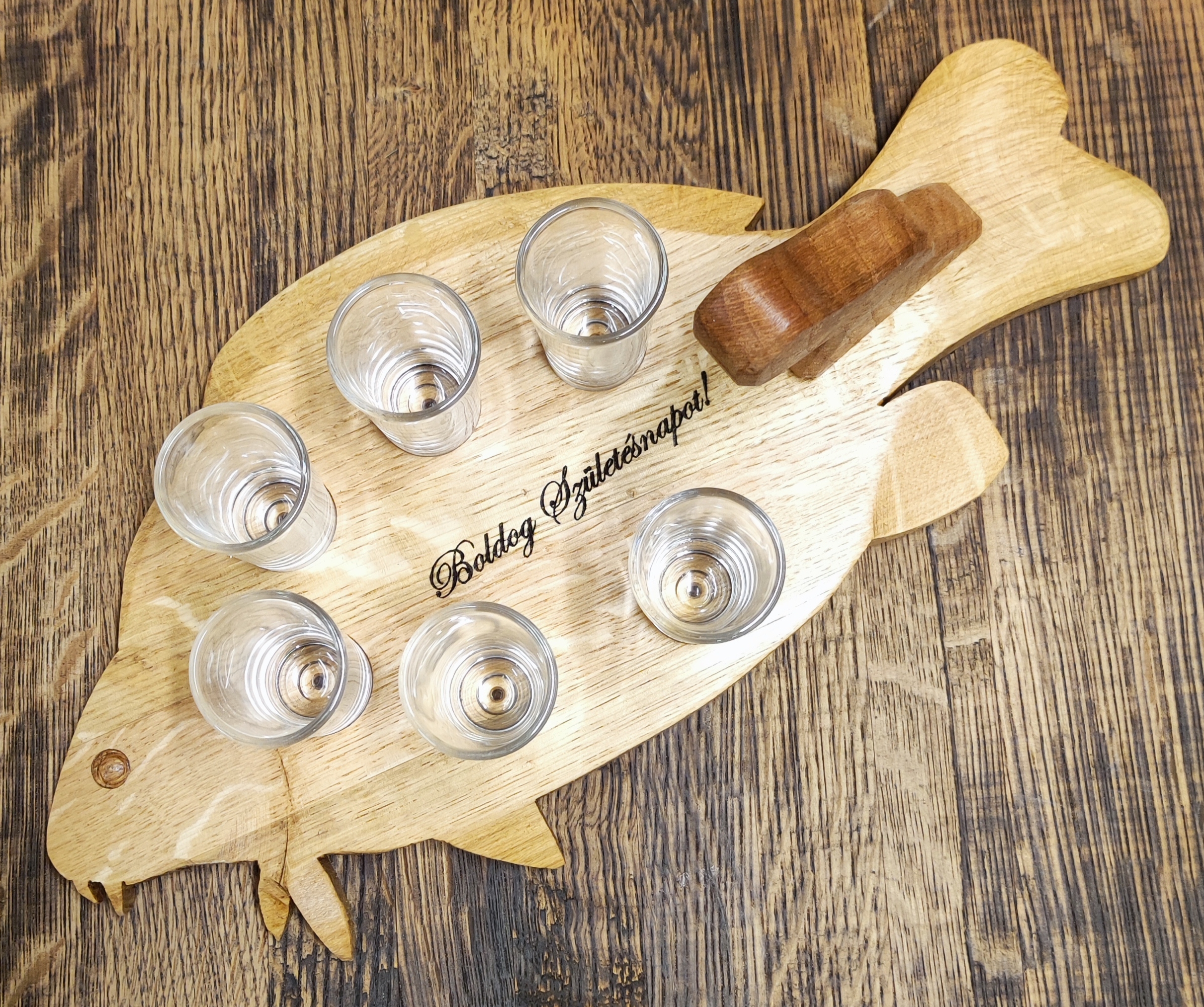 Tölgyfából készült lazúrozott vagy olajozott kínáló hal formában, sima poharakkal.