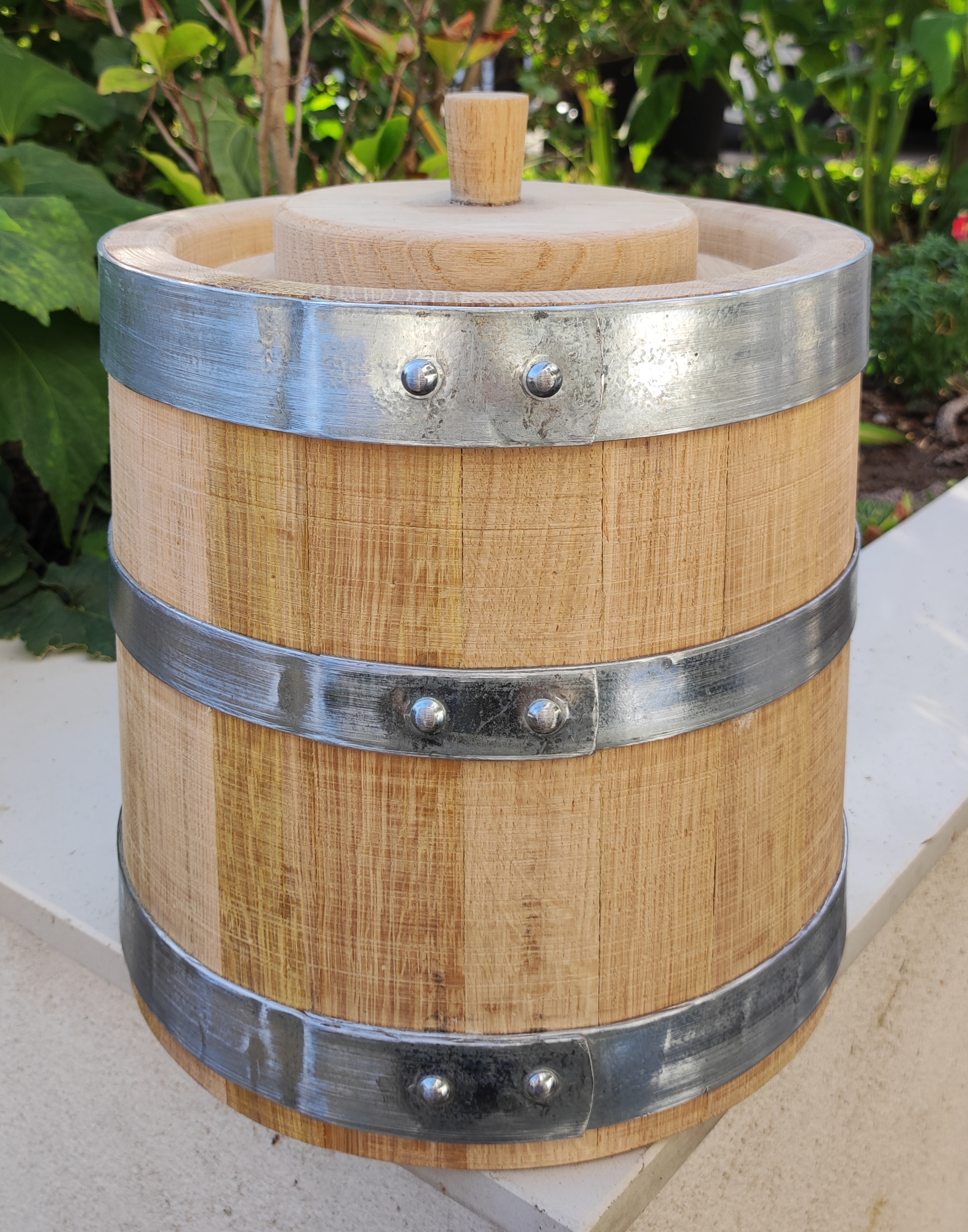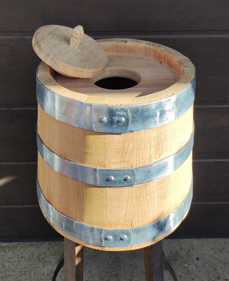 These are fermenting vessels designed specifically for making “dobálós savanyúság” (“tossed” pickled vegetables), a traditional method where whole or large-cut vegetables are placed in brine without tightly packing or pressing them, often “tossed” in casually — unlike shredded cabbage, which is packed and pressed. A stand is available upon request, which raises the tub by 5 centimeters off the ground, protecting it from soaking up moisture.