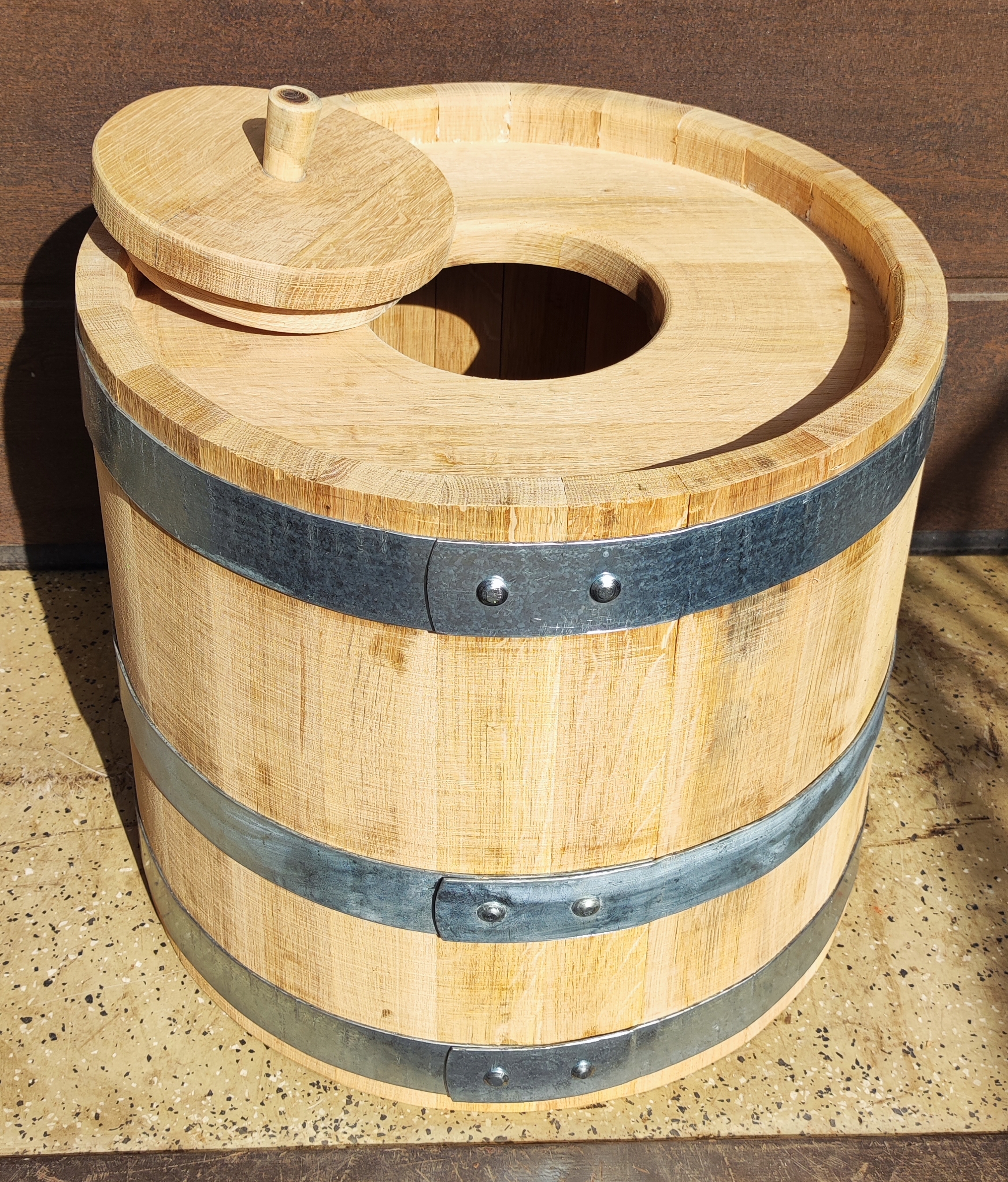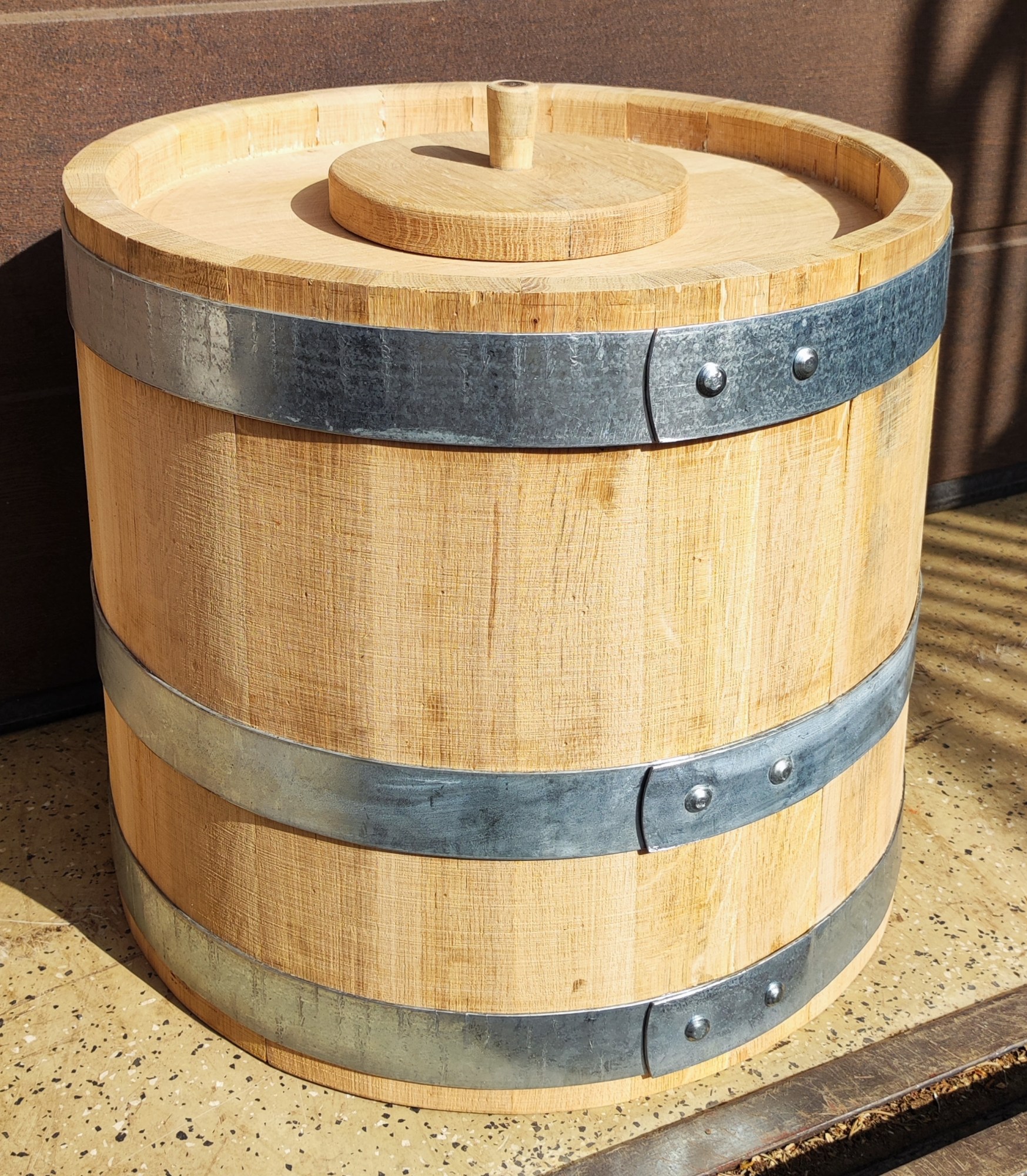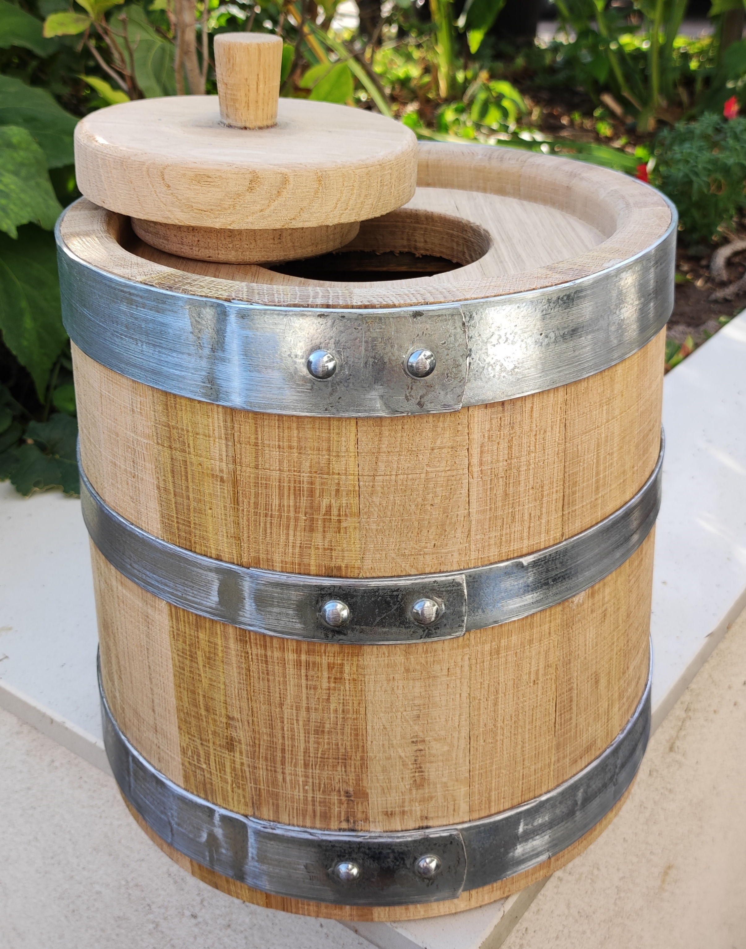 Pickling tubs made of oak wood, equipped with dip-galvanized hoops and a lid.