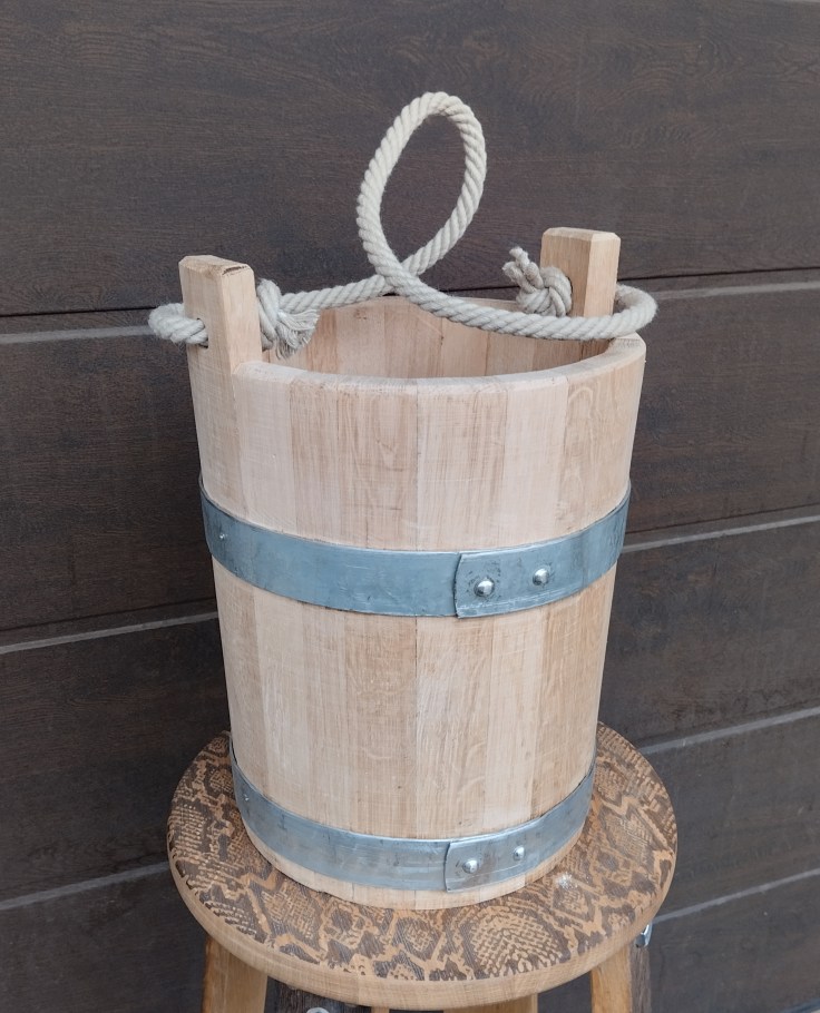 Tölgyfából készült kútvödör tűzihorganyzott abroncsokkal, sima, hajlított szemes vagy kötél füllel ellátva.