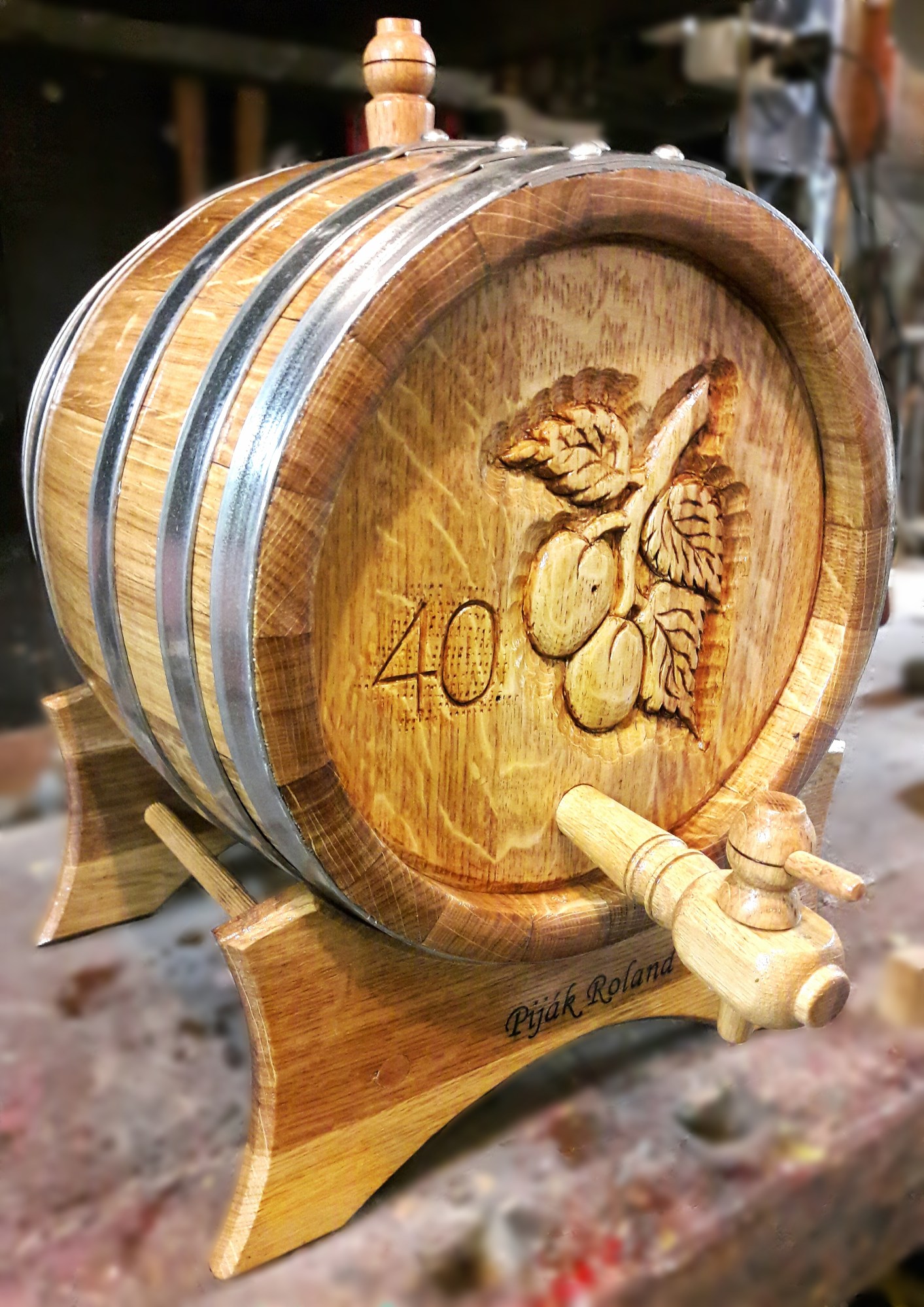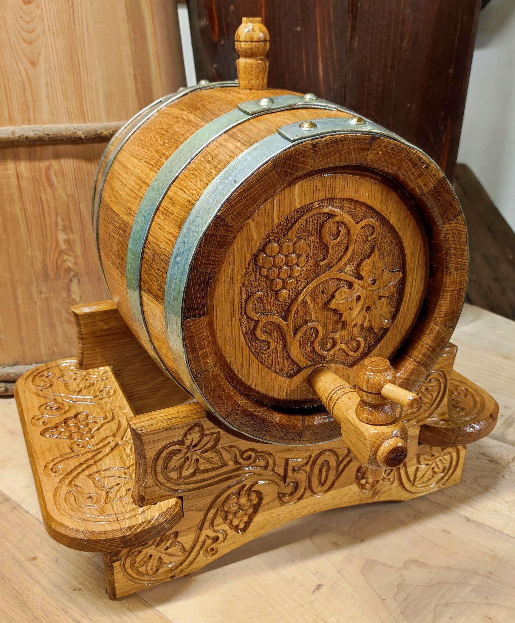 Kérem vegye figyelembe, hogy nagy űrtartalombeli eltérés esetén a faragás módosulhat. Egy 50 literes hordón jól mutató faragás nehezen kivitelezhető 3 literes hordóba.