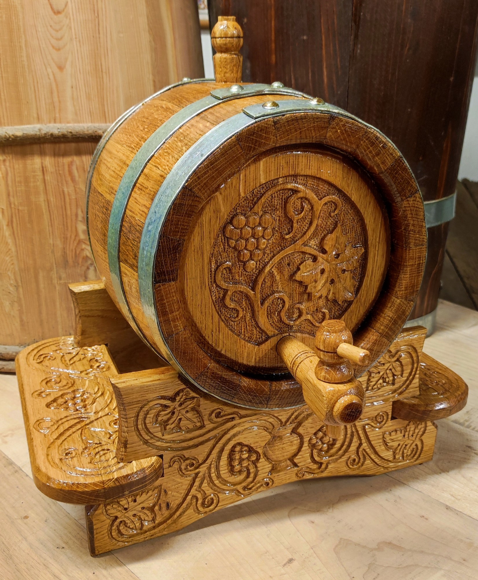 Barrels made of oak and mulberry with dip-galvanized hoops, available with stand and wooden tap. With brandy glass holder stand, custom decoration: burning, laser engraving, hand painting or carving on request.