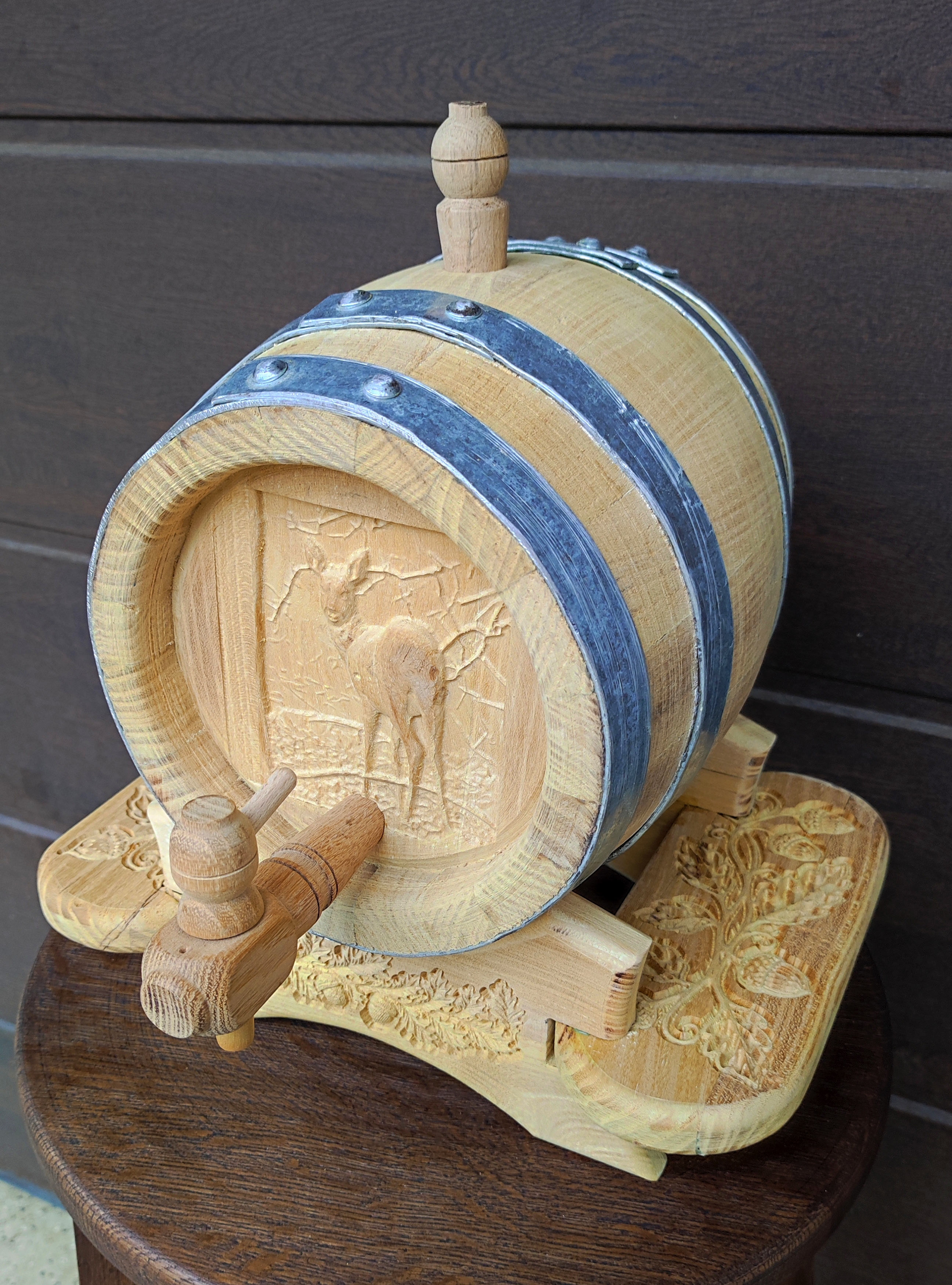 3 literes eperfa hordó őzsuta faragással és tölgy motívumokkal díszített állvánnyal Üzenjen! Kilépés a válaszból Δ