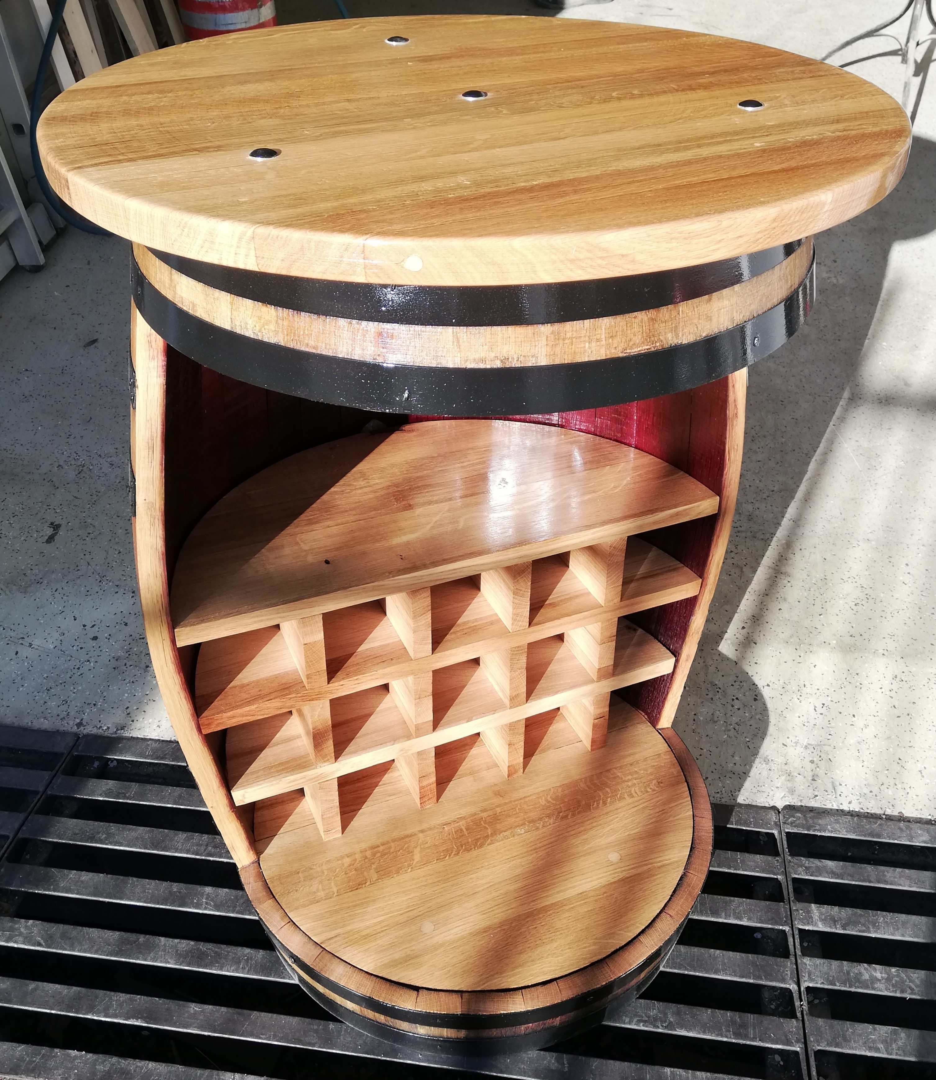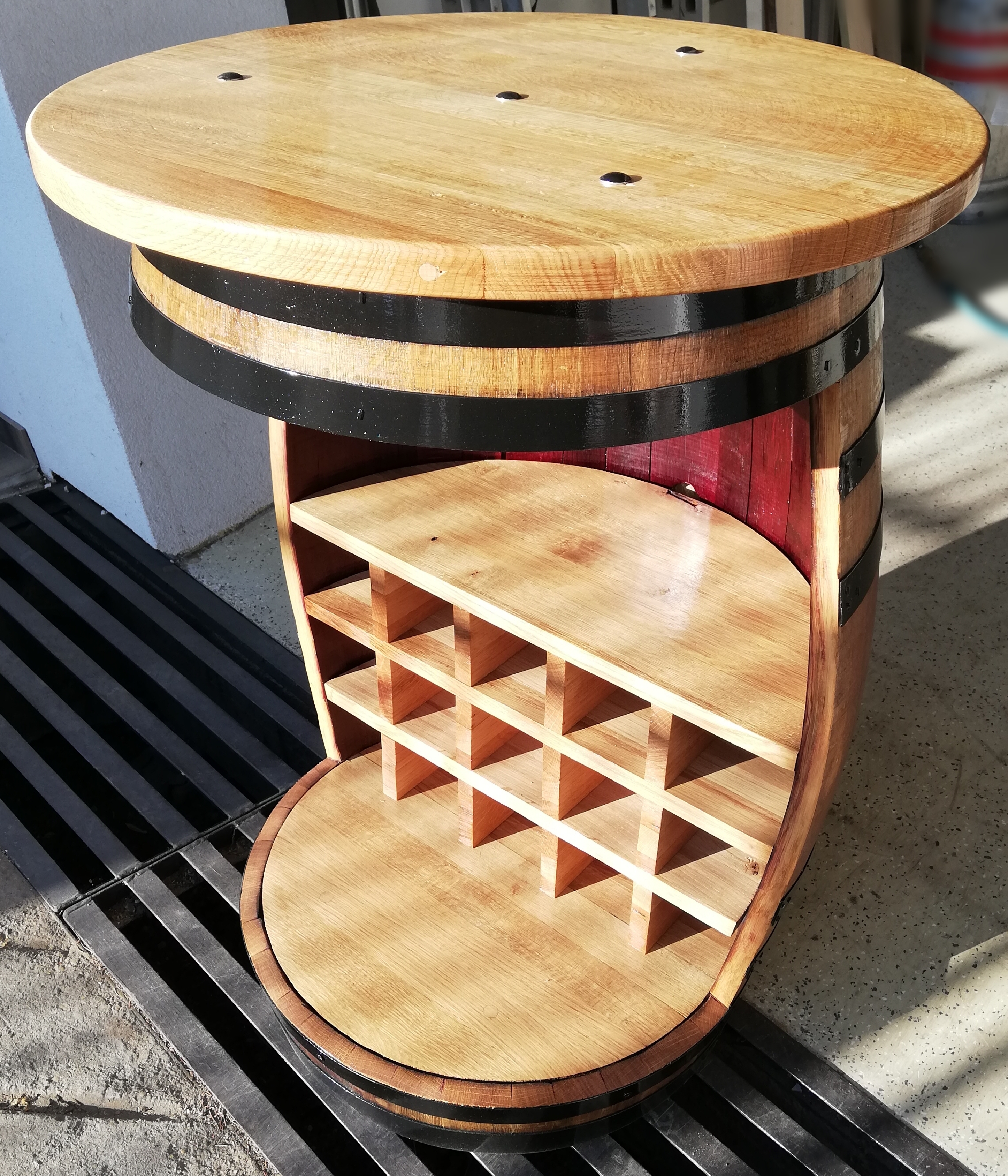 ~225-250 literes csiszolt tölgyfa hordóból készült bortartó asztal 70 cm átmérőjű, 3 cm vastag asztallappal kemény lombos fából, fekete abroncsokkal, lakkozva