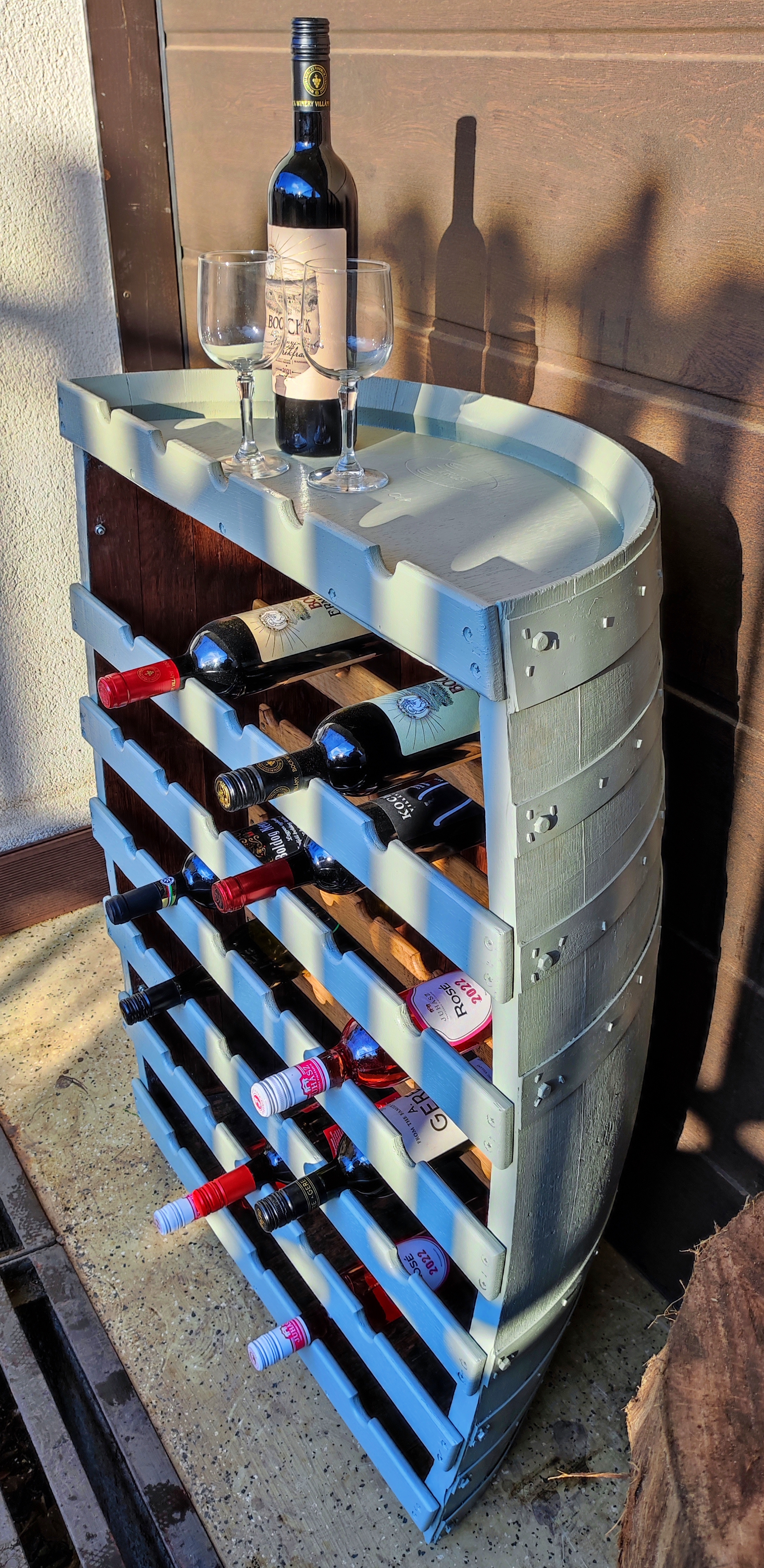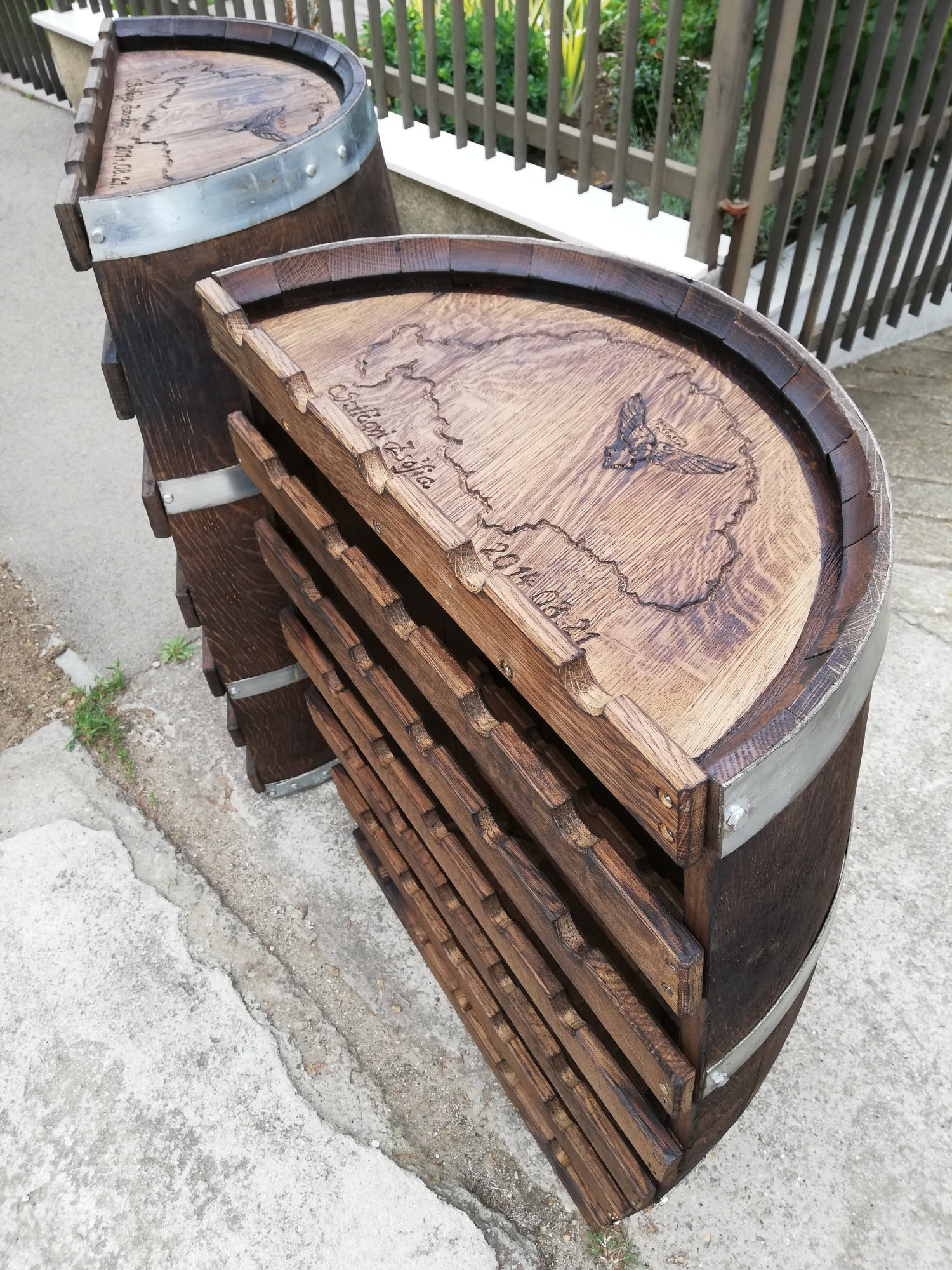 Tölgyfa hordóból készült bortartók és bortartó asztalok ragasztva, rögzített abroncsokkal, használt vagy új hordóból, igény szerint csiszolva, választható kiegészítőkkel, felületkezeléssel.