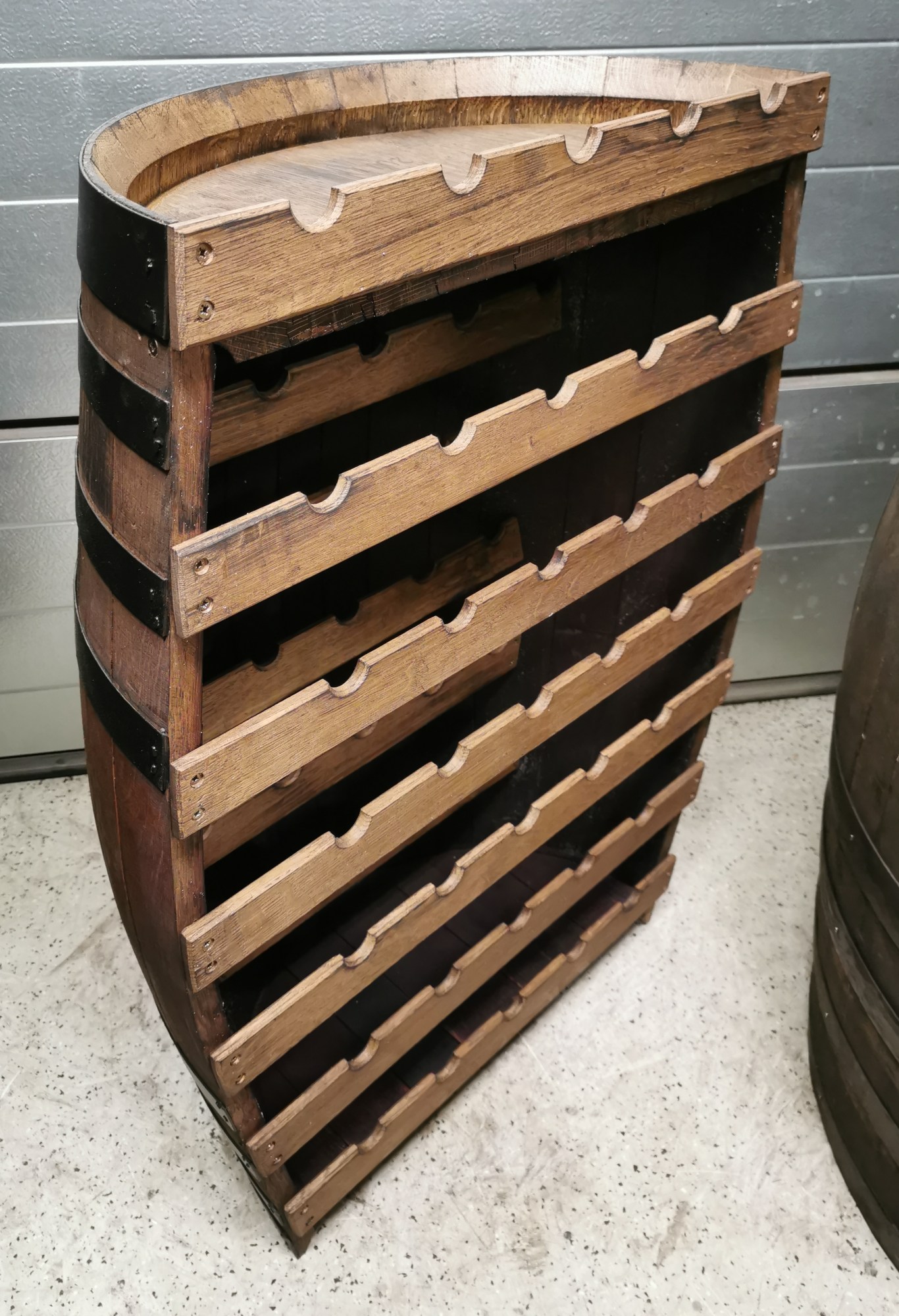 300 literes használt tölgyfa boroshordóból készült, 38 palack tárolására alkalmas szürke bortartó olajozott belsővel