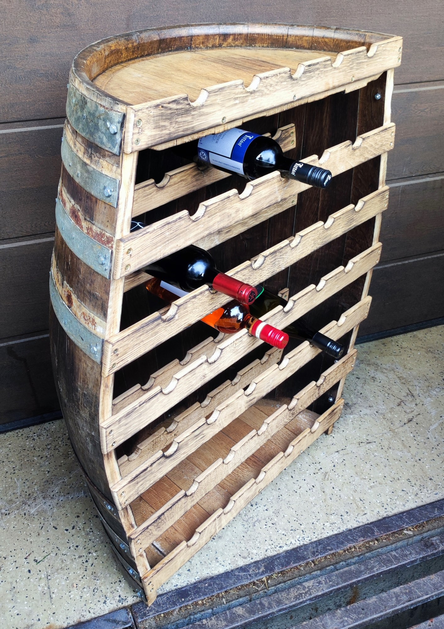 Tölgyfa hordóból készült bortartók és bortartó asztalok ragasztva, rögzített abroncsokkal, használt vagy új hordóból, igény szerint csiszolva, választható kiegészítőkkel, felületkezeléssel.