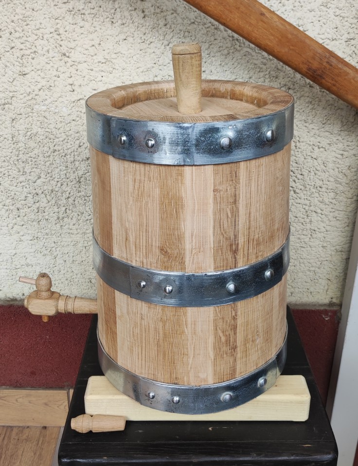 ~8 literes tölgyfa érlelő dézsa felszerelt talppal, csappal, dugóval, lakkozva
