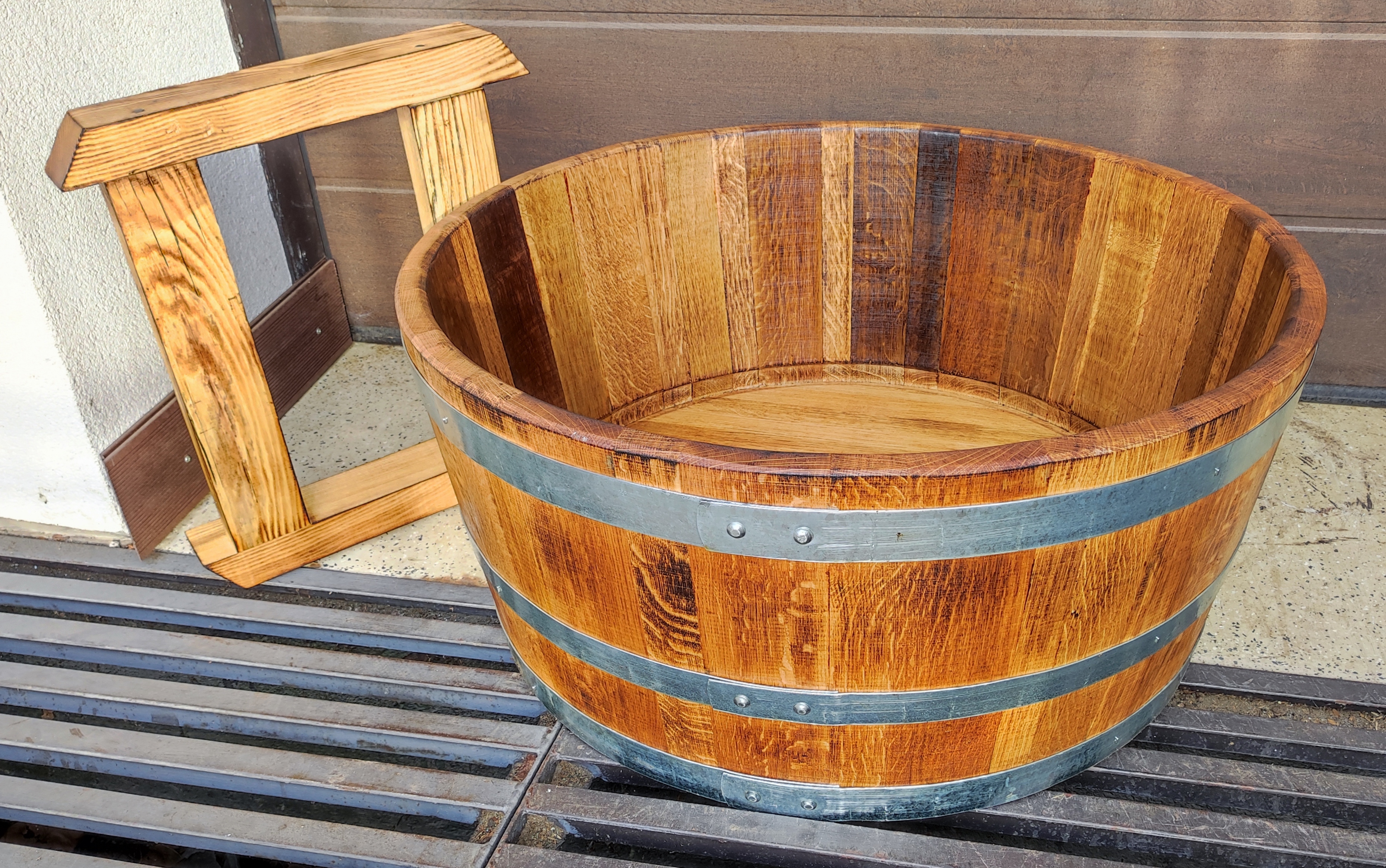 45 cm magas, 80 cm átmérőjű tölgyfa zuhanydézsa ragasztva, ki- és beszállást könnyítő kivágással, fa lábbal, perzselve, olajjal felületkezelve