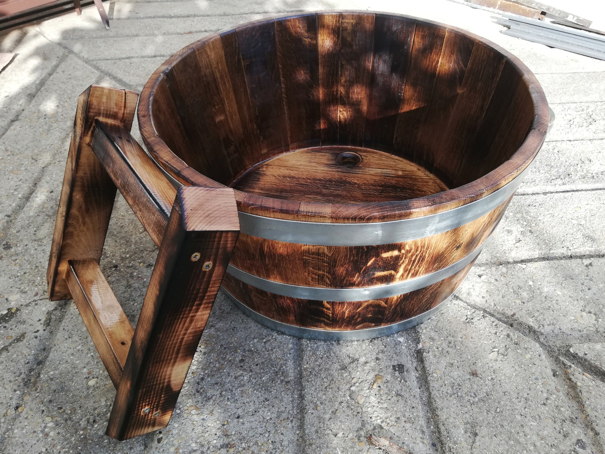 45 cm magas, 80 cm átmérőjű tölgyfa zuhanydézsa ragasztva, fa lábbal, perzselve, olajjal felületkezelve