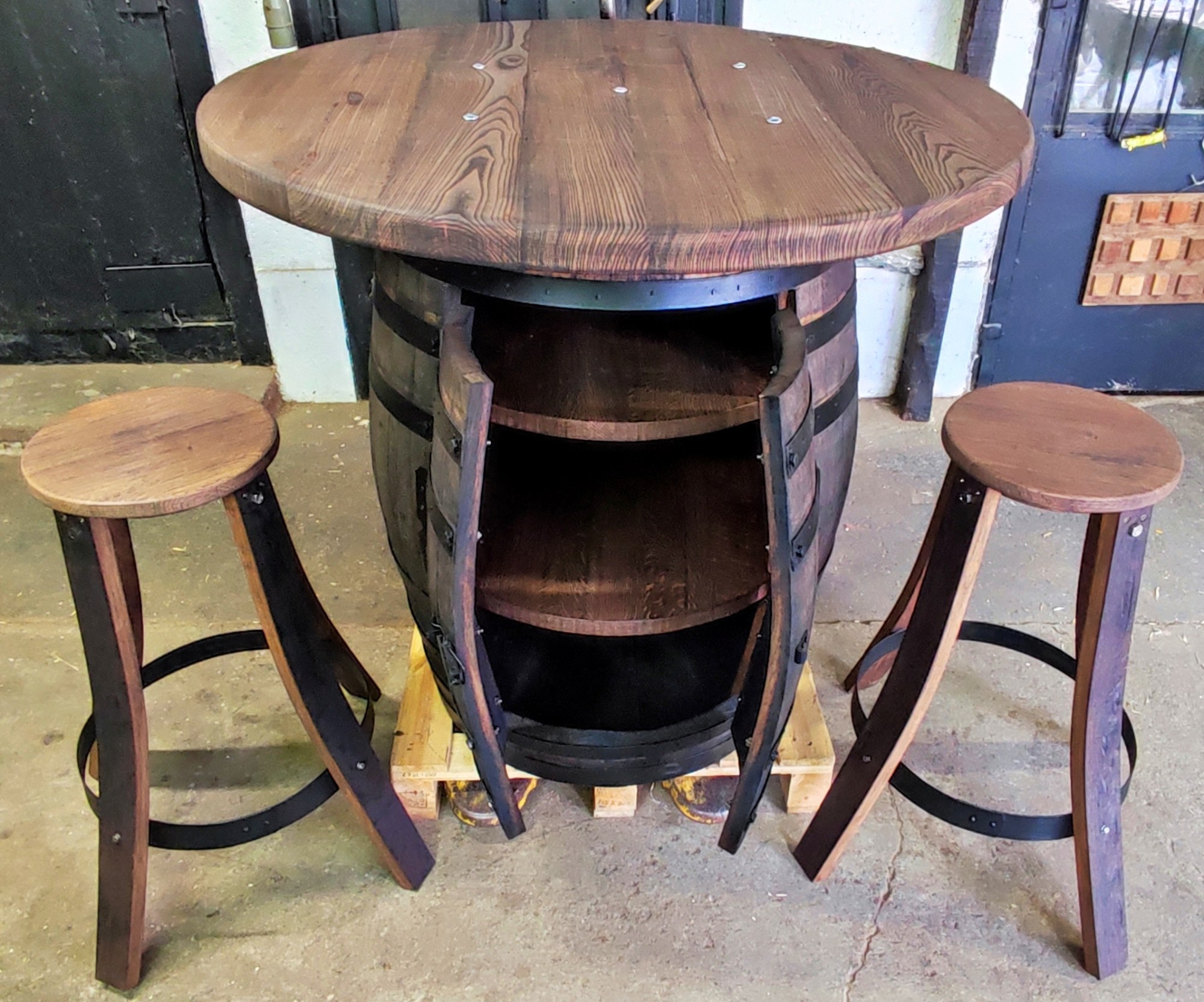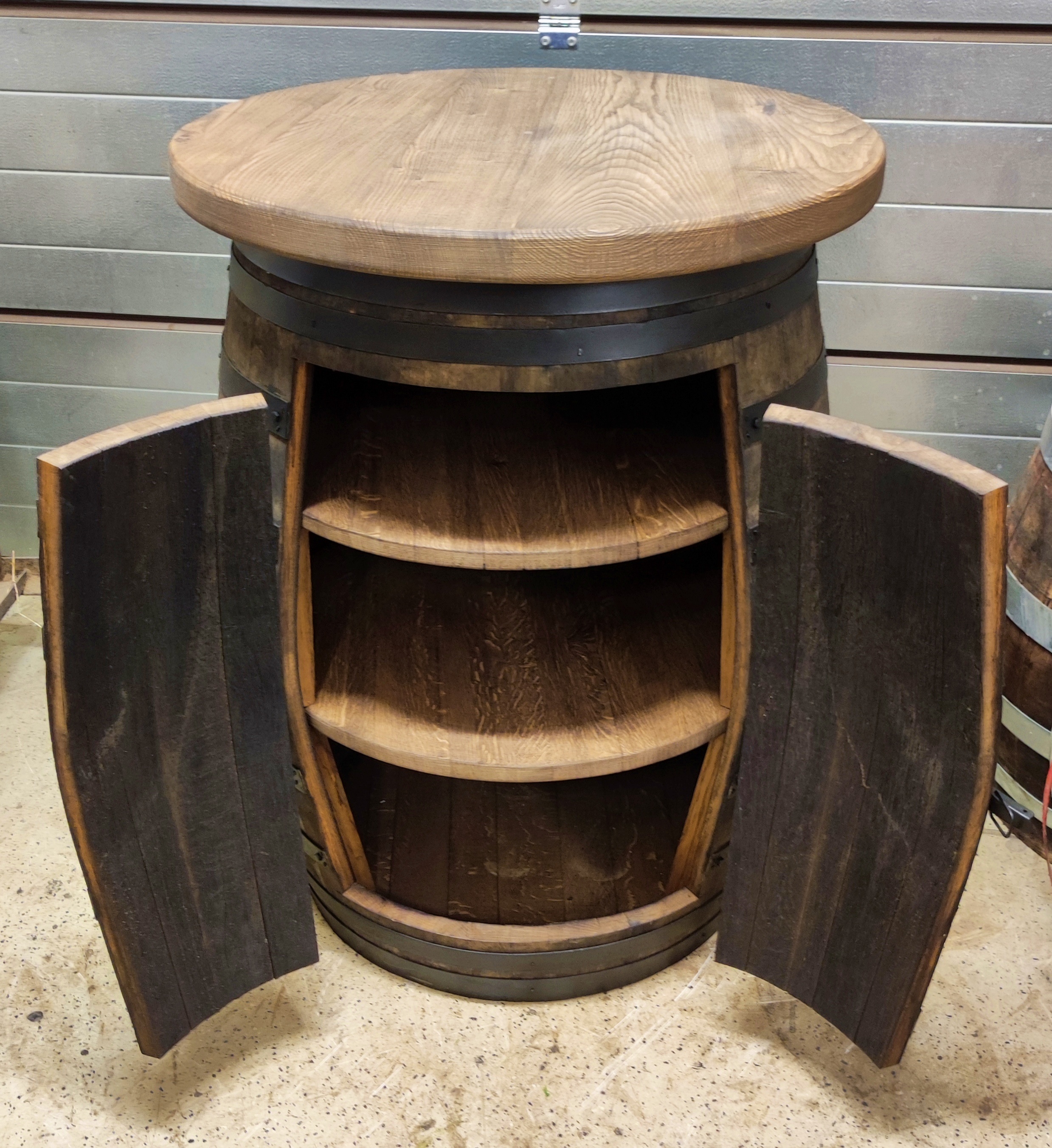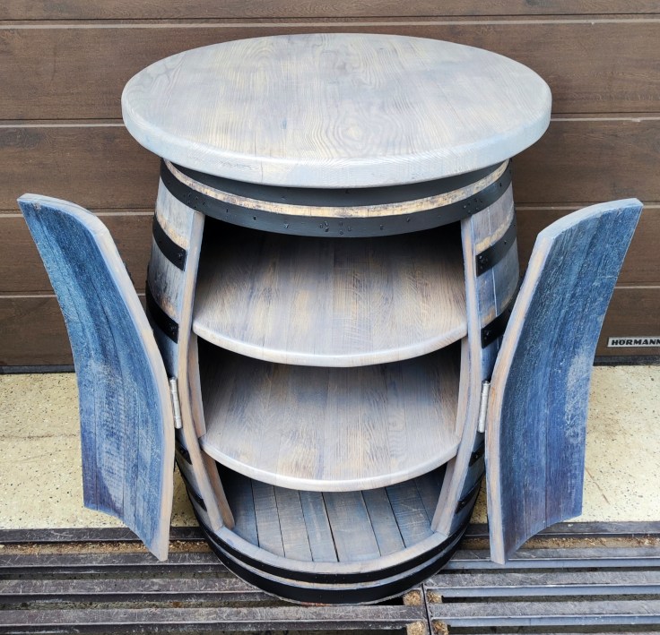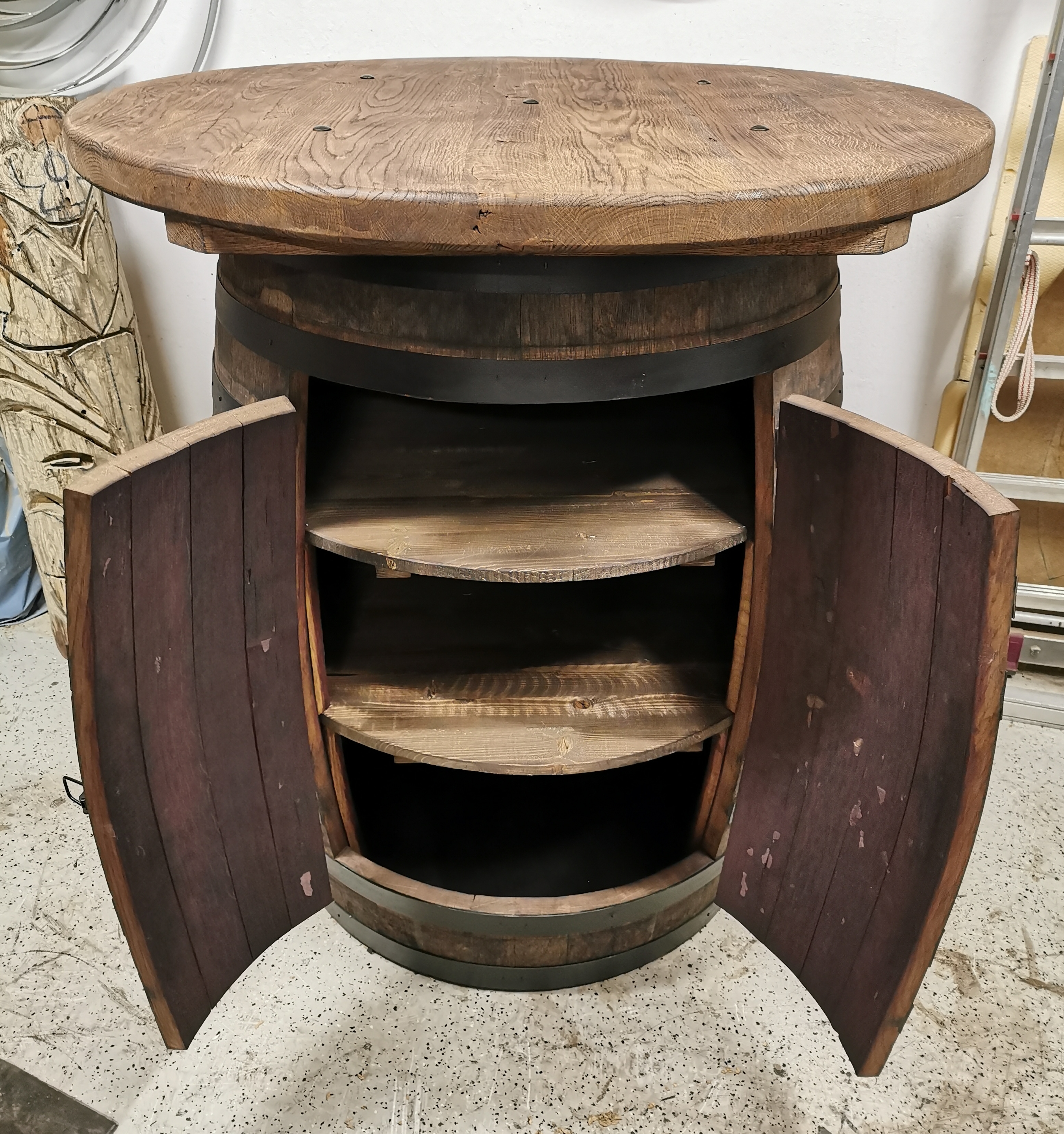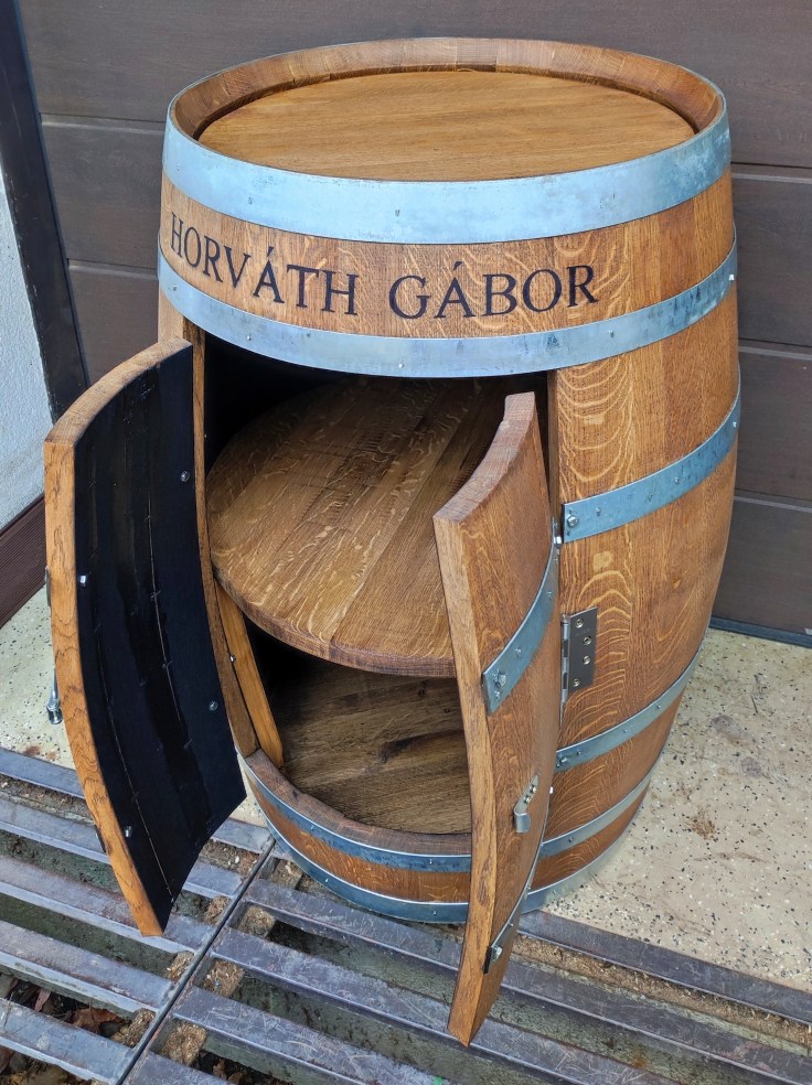 Ajtózott, polcos hordó asztal ~225-250 literes új, csiszolt boroshordóból 80 cm átmérőjű, 4,5-5 cm vastag asztallappal kemény lombos fából, dupla tölgyfa polccal, perzselve, teak olajos külső-belső felületkezeléssel, fényes zsanérokkal és békazárral #1 #3