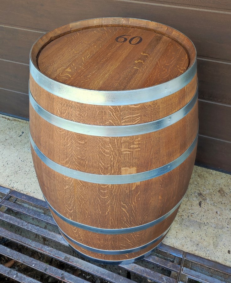 Hordó asztal ~225-250 literes új, csiszolt tölgyfa hordóból paliszander lazúr felületkezeléssel, sima abroncsokkal