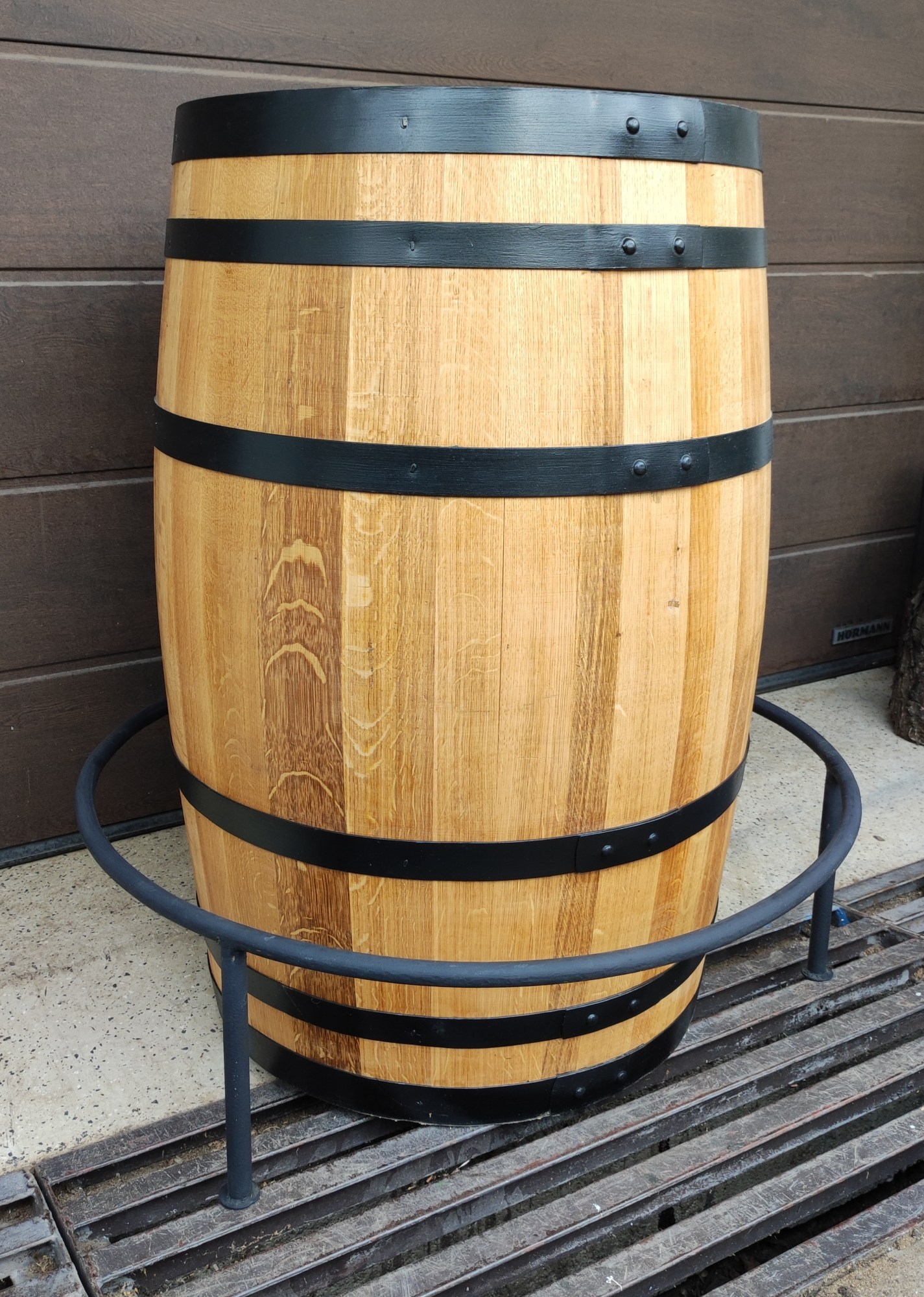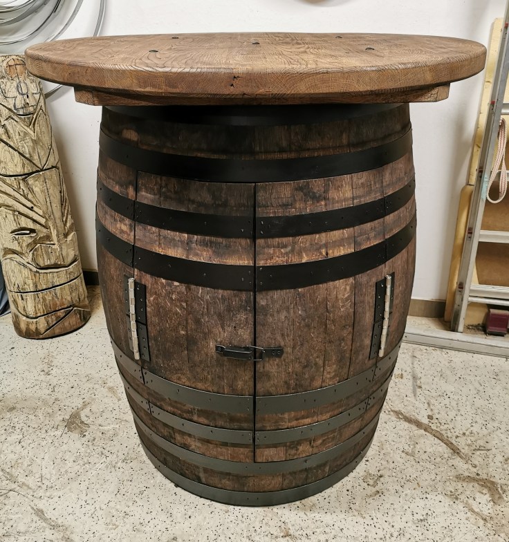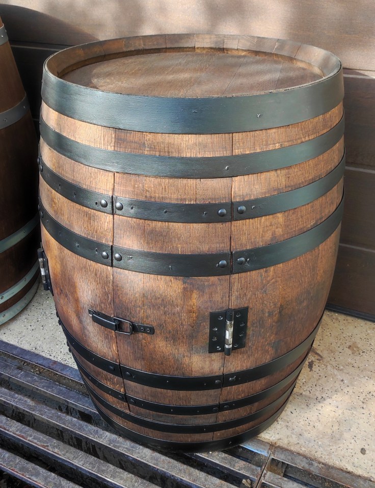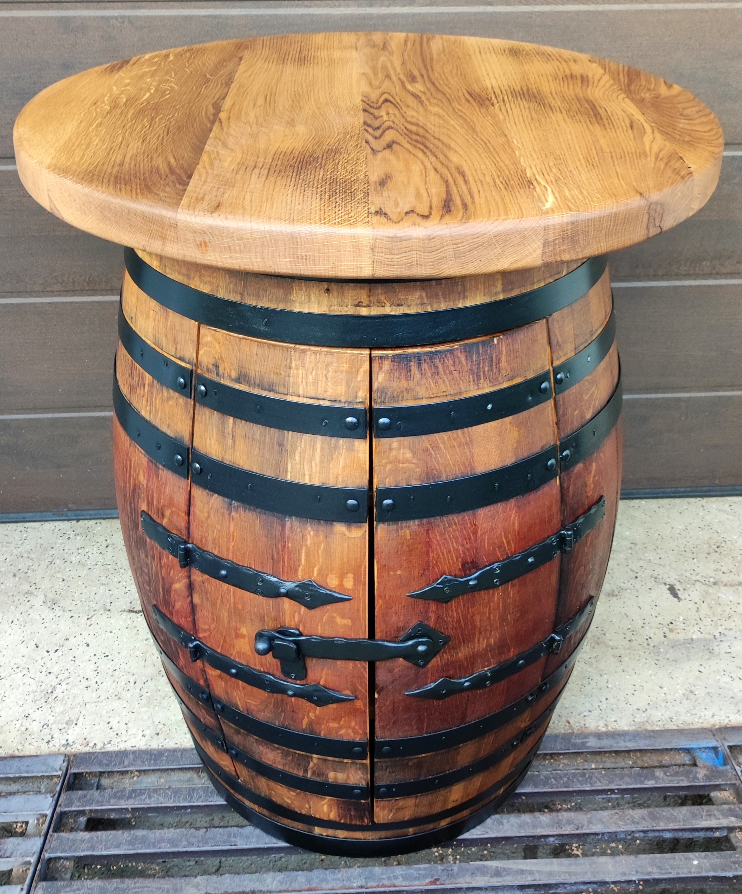 Ajtózott, polcos hordó asztal ~225-250 literes új, csiszolt boroshordóból 70 cm átmérőjű, 3 cm vastag asztallappal kemény lombos fából, fenyő polccal, perzselve, paliszander lazúr külső-belső felületkezeléssel, fekete abroncsokkal, feketére festett szimpla kovácsoltvas zsanérral és egyedi kovácsoltvas zárral #9 #12