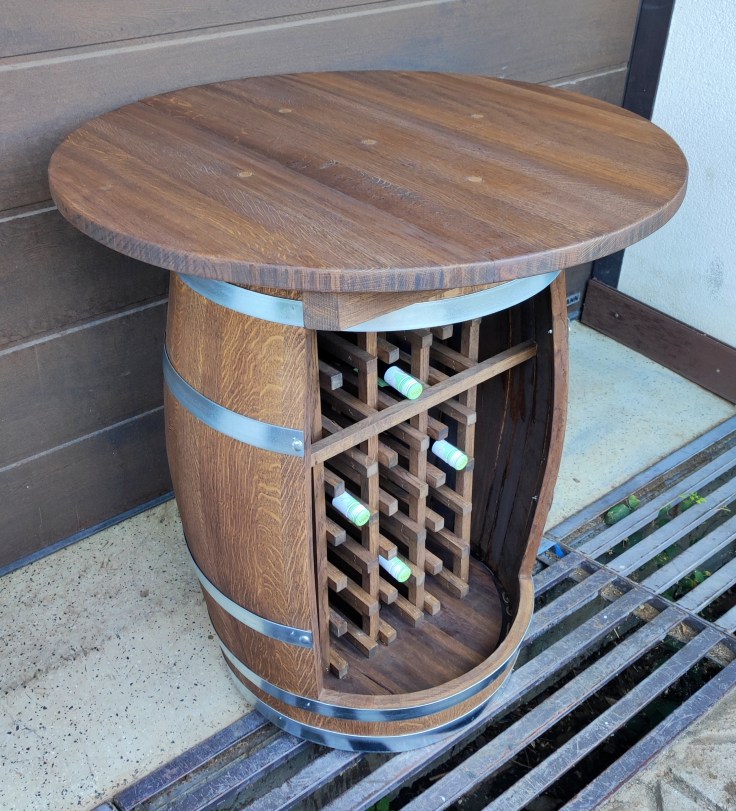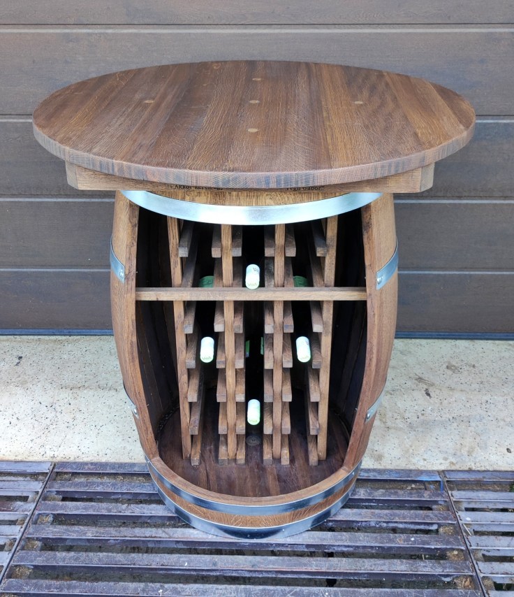 Bortartó hordó asztal ~225-250 literes új, csiszolt boroshordóból az ajtó helyének kivágásával, 90 cm átmérőjű, 3 cm vastag asztallappal kemény lombos fából, 21 palack tárolására alkalmas bortartóval, perzselve, paliszander lazúr külső-belső felületkezeléssel, sima abroncsokkal
