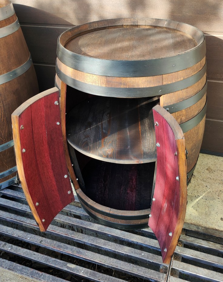 Ajtózott, polcos hordó asztal ~225-250 literes használt boroshordóból, fenyő polccal, perzselve, paliszander lazúr külső-belső felületkezeléssel, fekete abroncsokkal, fekete zsanérokkal és fekete békazárral #2 #4