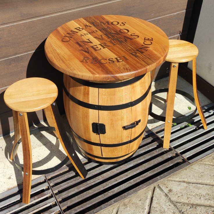 A képen látható hordó asztal teljes ára lézergravírozás nélkül 175.000 Forint.