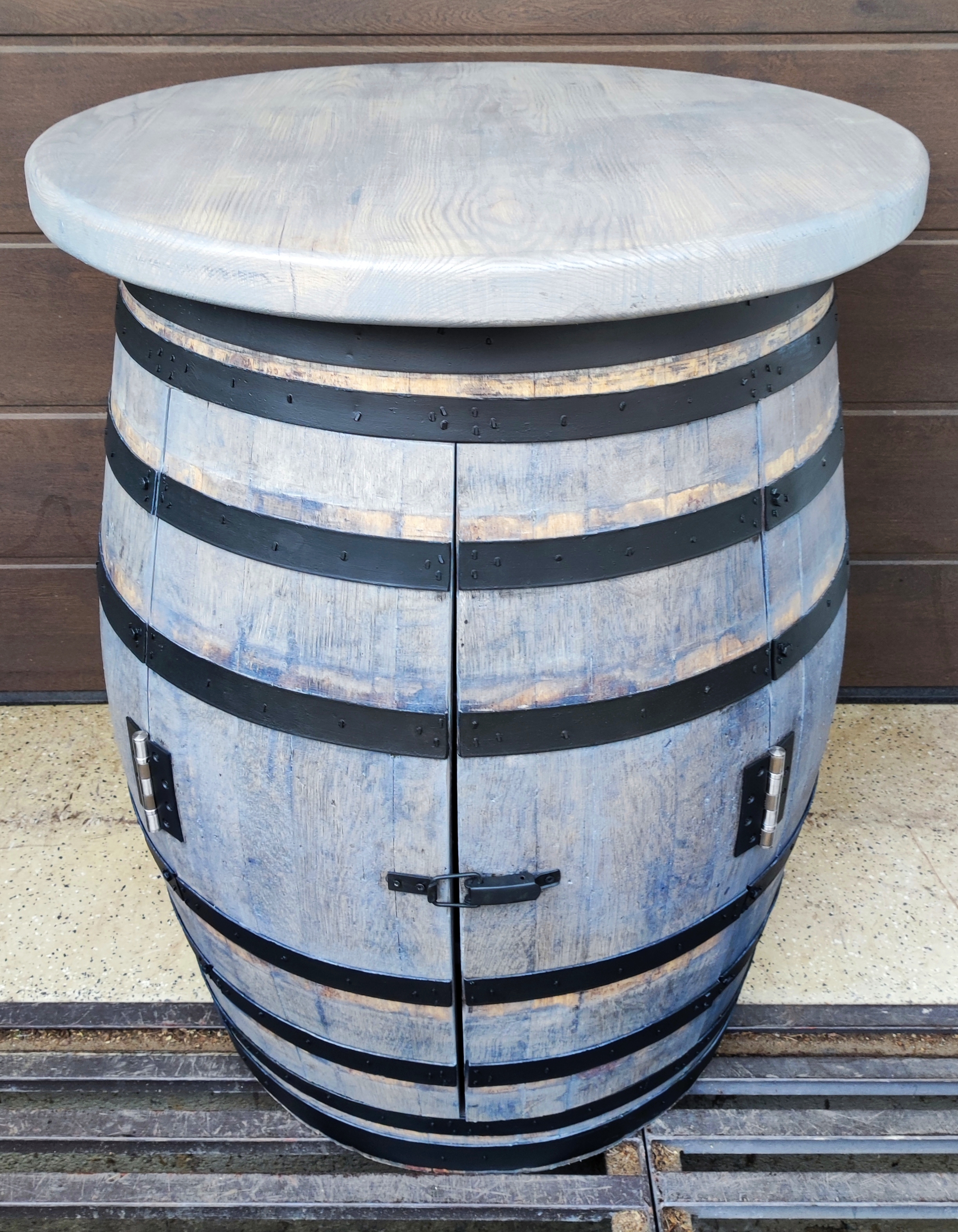 Ajtózott, polcos hordó asztal ~300 literes használt boroshordóból 110 cm átmérőjű, 4,5 cm vastag asztallappal kemény lombos fából, fenyő polccal, perzselve, világos platánszürke lazúr külső-belső felületkezeléssel, fekete abroncsokkal, fekete dupla zsanérral és fekete békazárral #2×2 #4