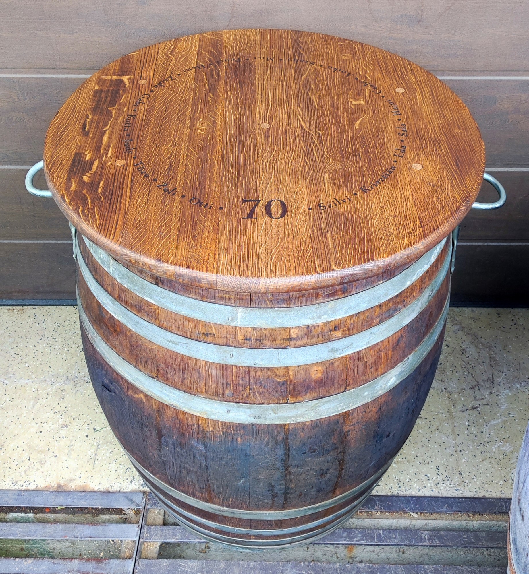 Hordó asztal ~225-250 literes használt boroshordóból 70 cm átmérőjű, 3 cm vastag asztallappal kemény lombos fából, hordozófülekkel, perzselve, paliszander lazúr felületkezeléssel, sima abroncsokkal