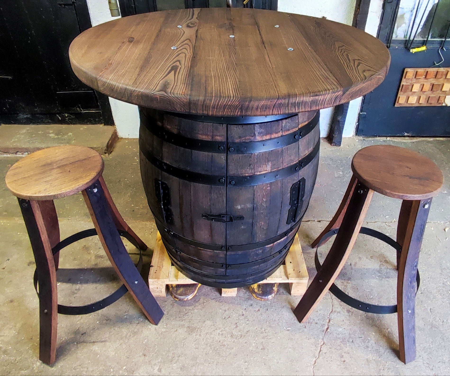 Oak barrel bar cabinets and bar tables made from used or new barrels as requested.