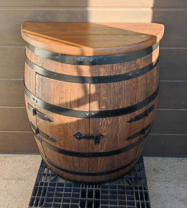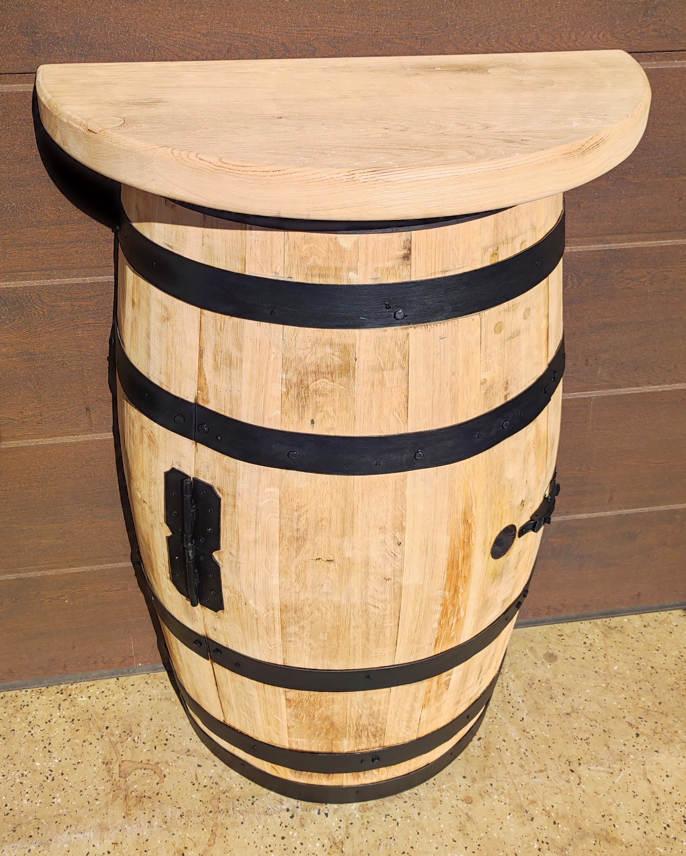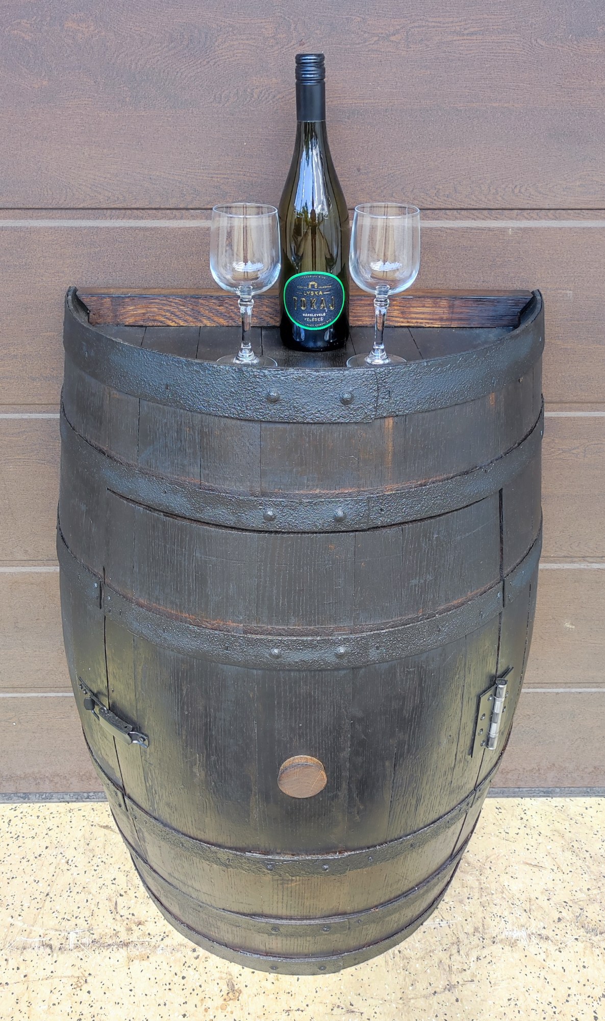 ~225-250 literes új, csiszolt tölgyfa hordóból kialakított félhordó szekrény ajtó kialakítással, tölgyfa polccal, 70 cm átmérőjű, 4,5-5 cm vastag fél asztallappal kemény lombos fából, fekete dupla kovácsoltvas zsanérral és fekete békazárral, fekete abroncsokkal, perzselve, natúr #10 #4