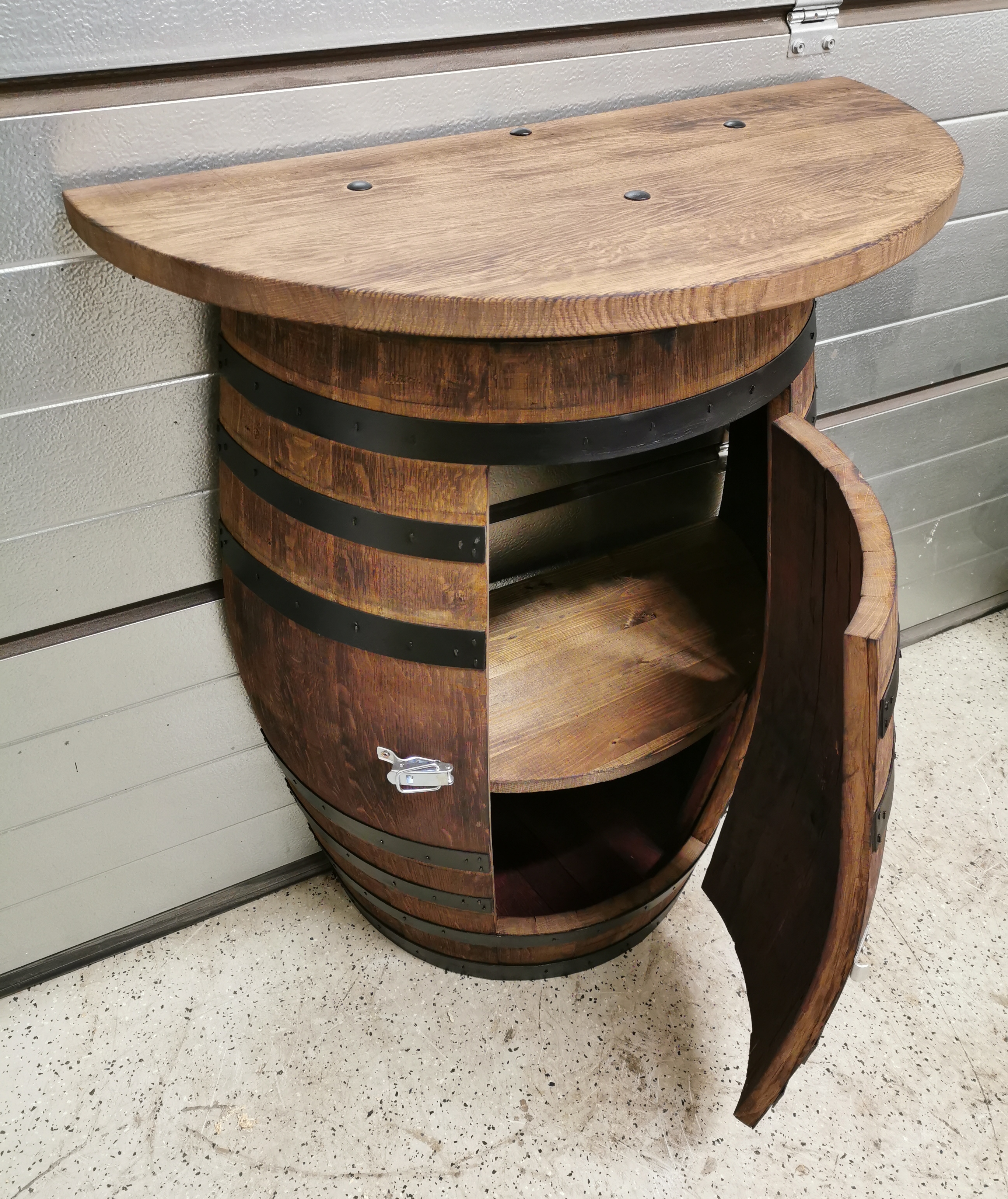 ~225-250 literes új, csiszolt tölgyfa hordóból kialakított félhordó szekrény dupla ajtó kialakítással, tölgyfa polccal, 70 cm átmérőjű, 4,5-5 cm vastag fél asztallappal kemény lombos fából, fekete dupla kovácsoltvas zsanérral és fekete egyedi kovácsoltvas zárral, fekete abroncsokkal, perzselve, teak olajjal kezelve #10 #12