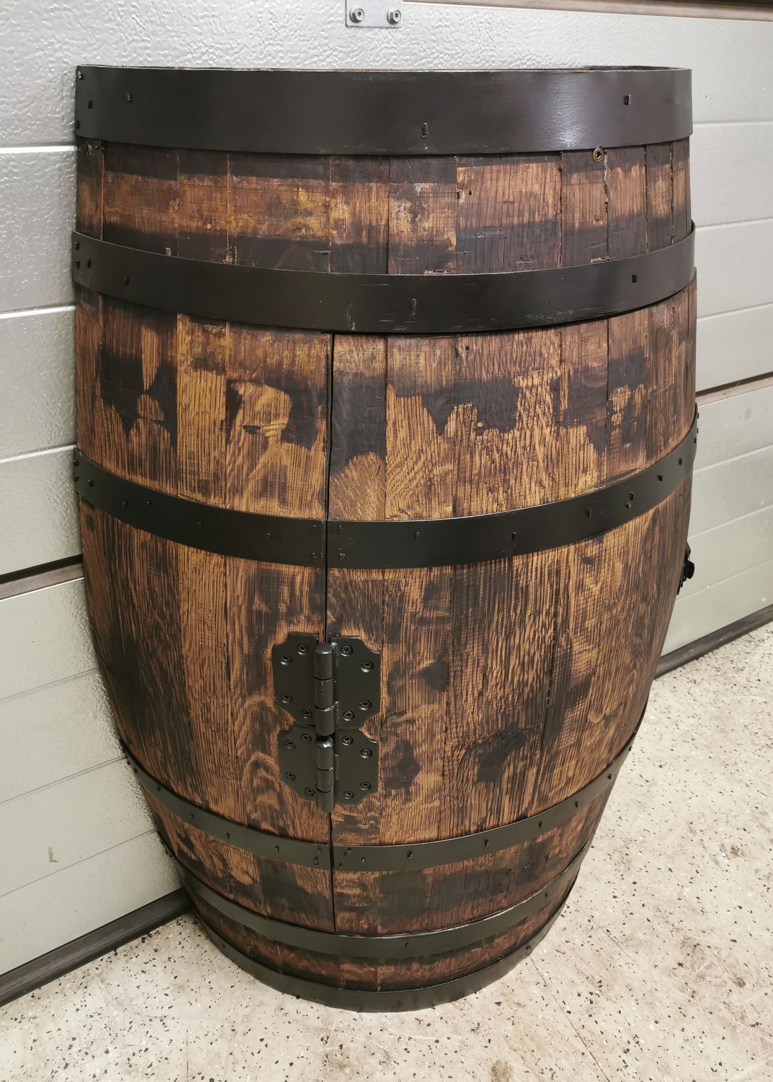 ~225-250 literes használt tölgyfa hordóból kialakított félhordó szekrény ajtó kialakítással, fenyő polccal, fekete abroncsokkal, fekete zsanérral és fekete békazárral, perzselve, paliszader lazúrral felületkezelve #2 #4