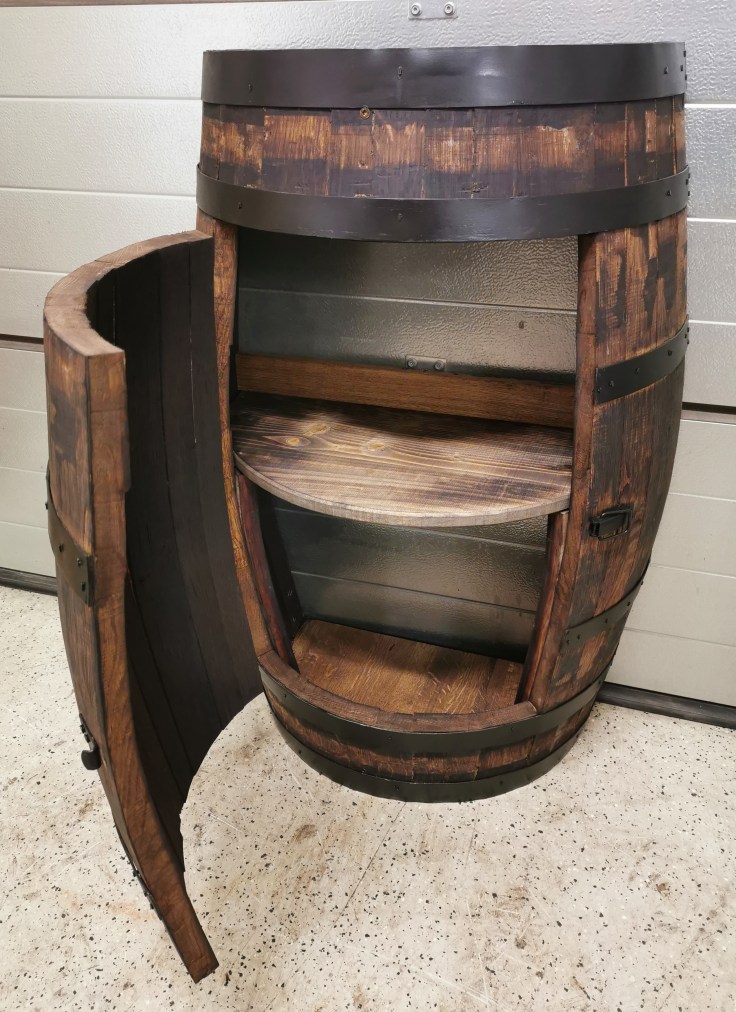 ~300 literes használt tölgyfa hordóból kialakított félhordó szekrény ajtó kialakítással, fenyő polccal, 70 cm átmérőjű, 4,5-5 cm vastag fél asztallappal kemény lombos fából, fekete abroncsokkal, perzselve, paliszader lazúrral felületkezelve, faragott ajtóval #1×2 #3