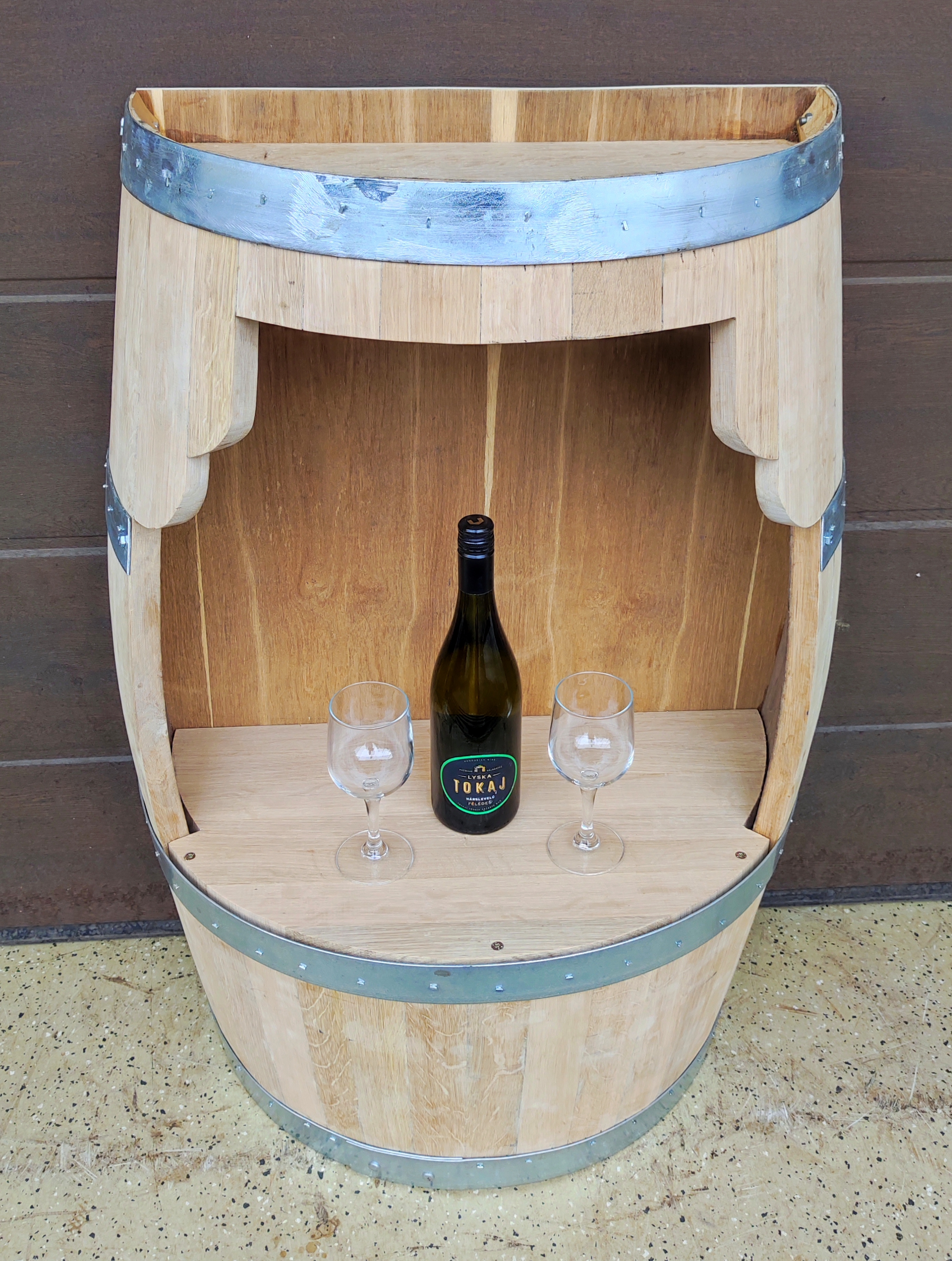 ~225-250 literes új, csiszolt tölgyfa hordóból kialakított nyitott félhordó szekrény, ajtó nélkül, díszített kivágással, hátlappal, tölgyfa polccal, natúr