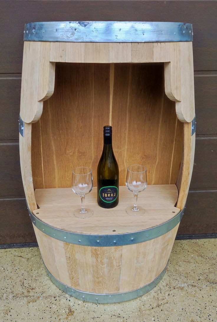 Tölgyfa hordóból készült bárszekrények és bárasztalok ragasztva, rögzített abroncsokkal, használt vagy új hordóból, igény szerint csiszolva, választható kiegészítőkkel, felületkezeléssel.