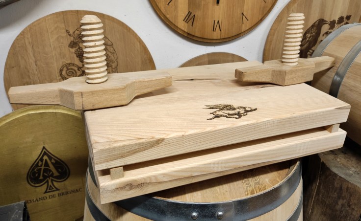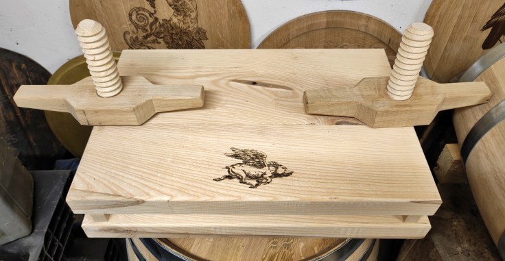 Large brawn press made of hardwood with wooden threads.