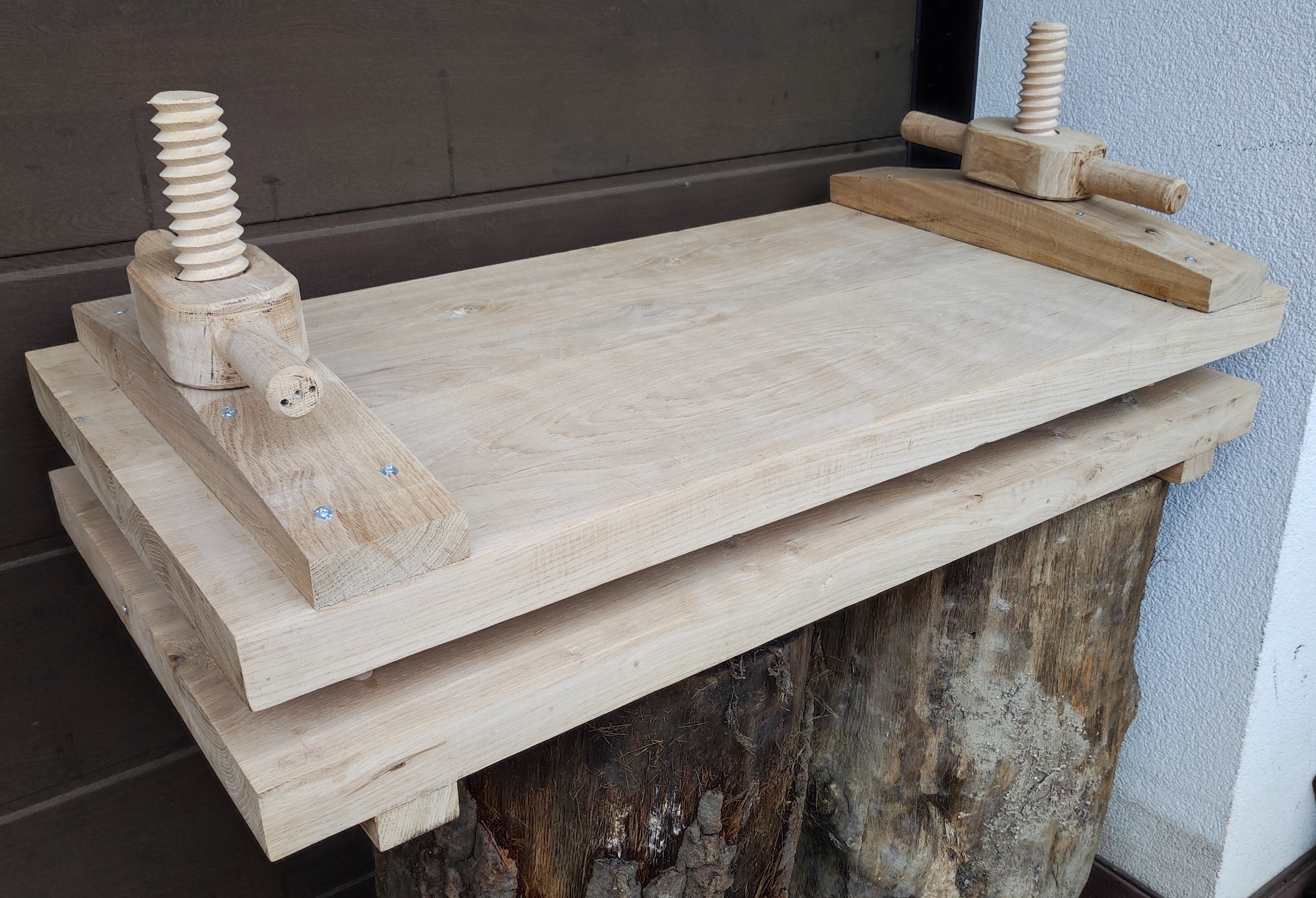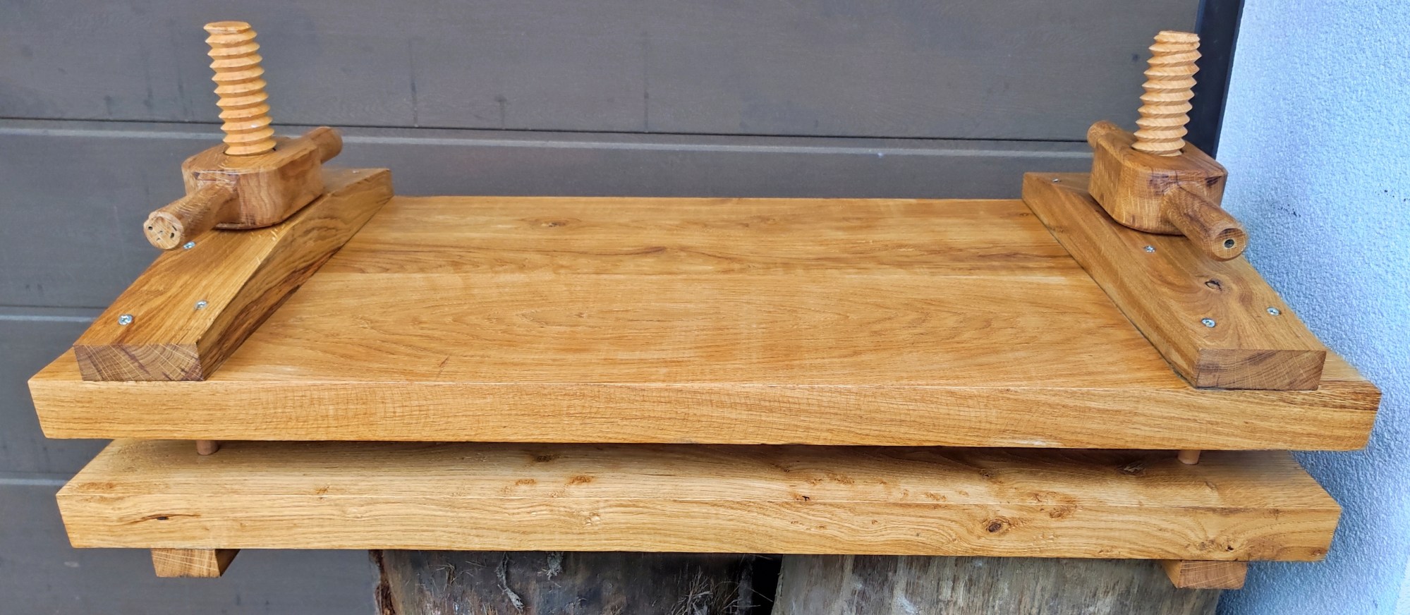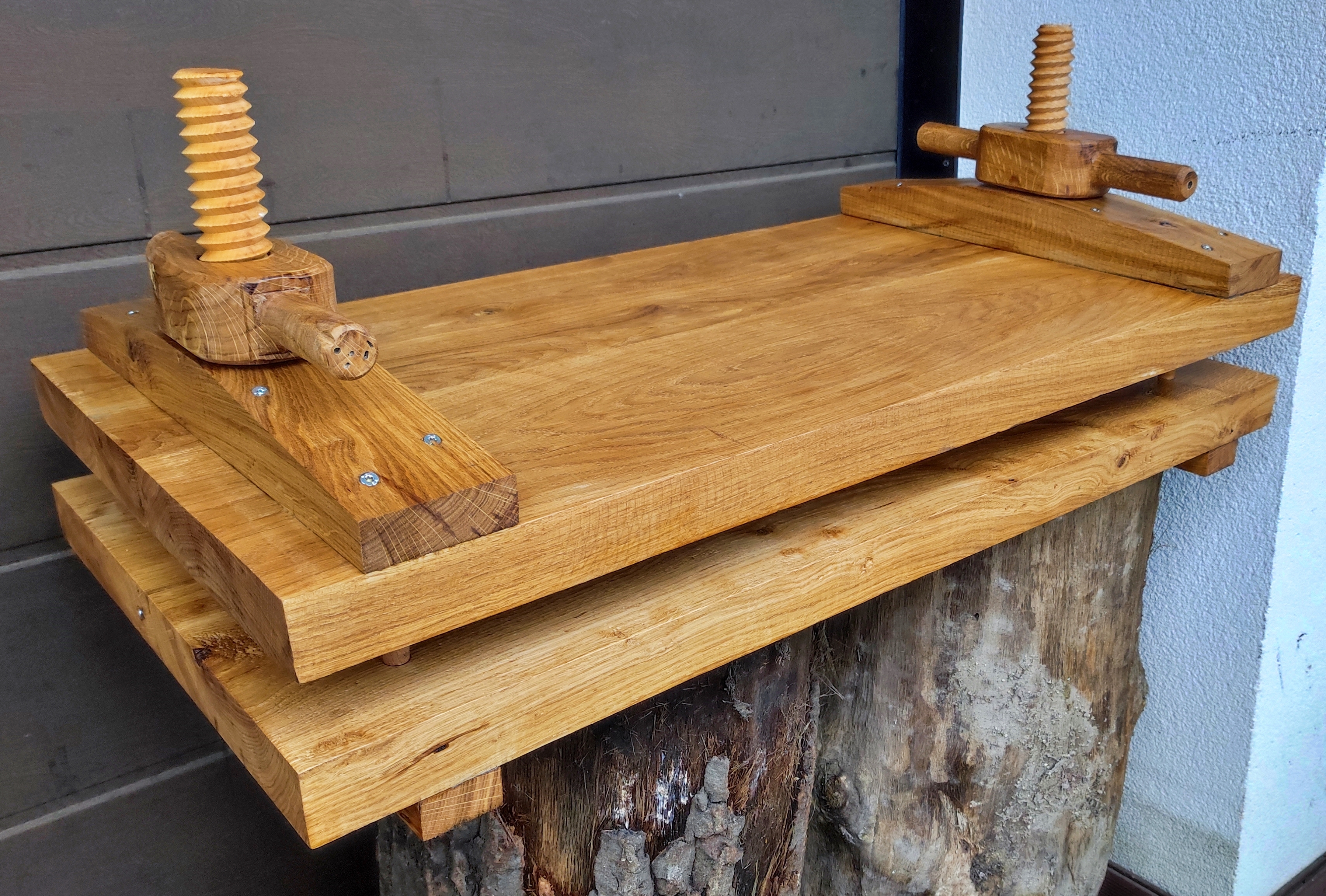 Keményfából készült nagyméretű disznósajt prés fa menetekkel, olajjal kezelve