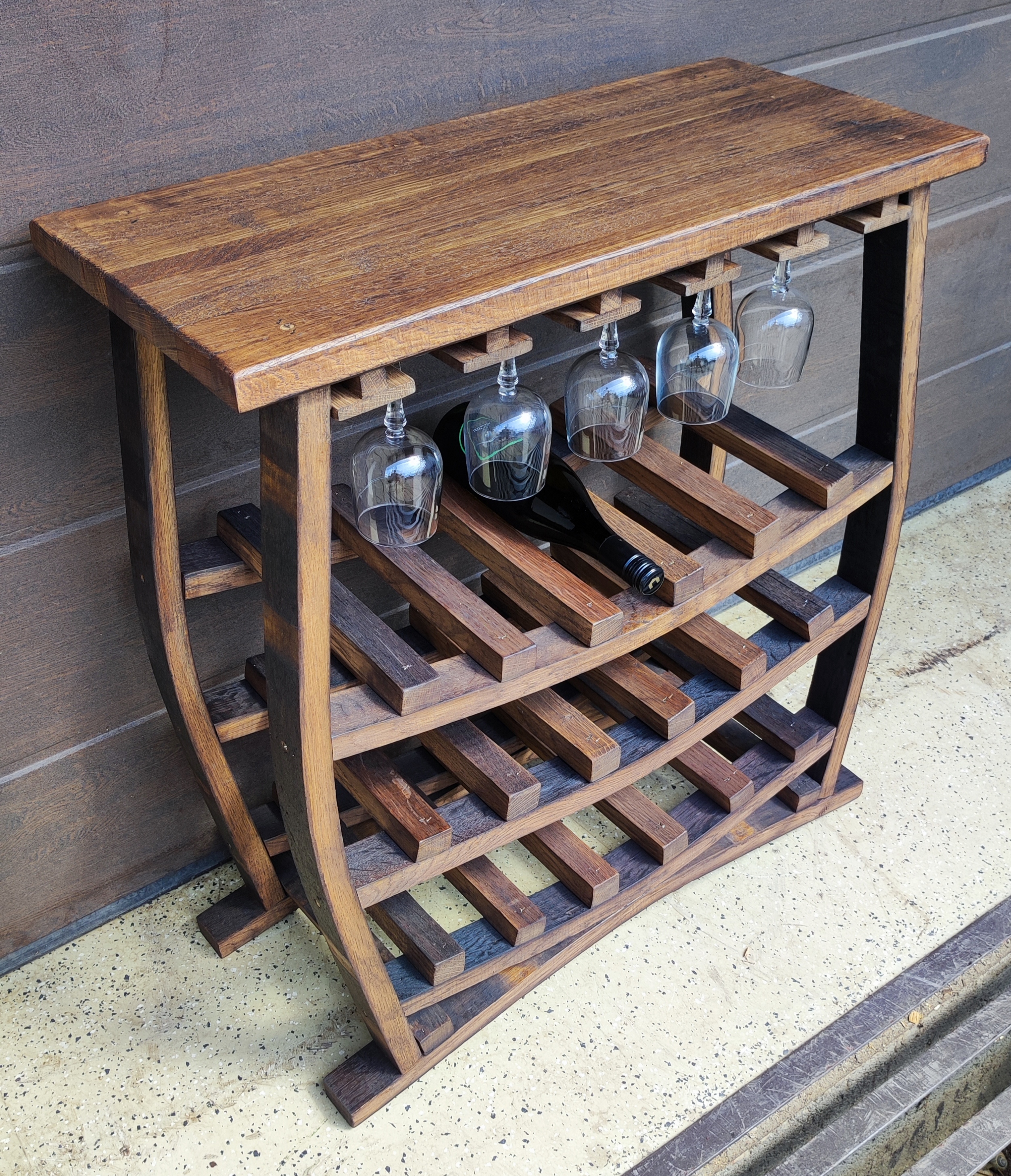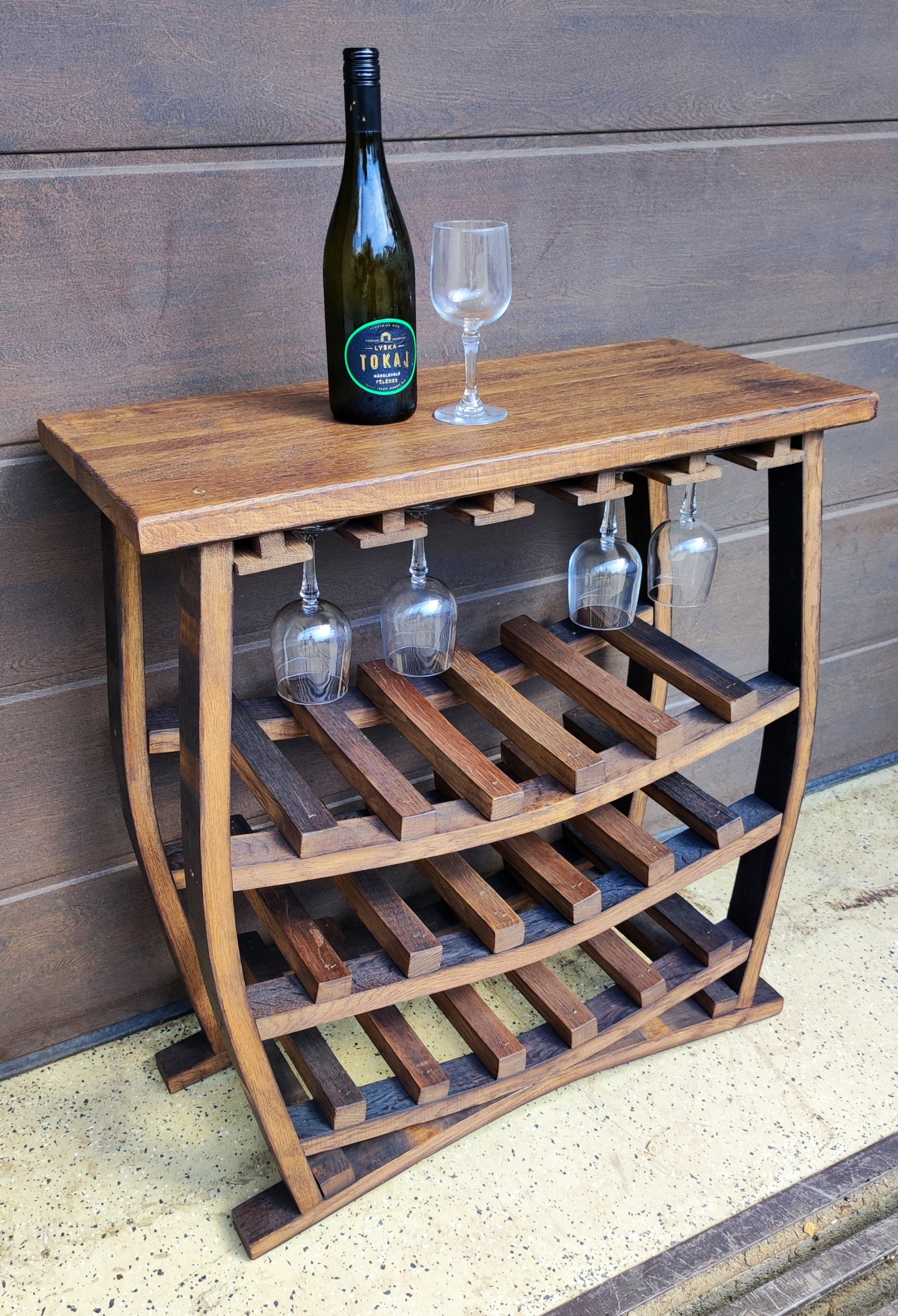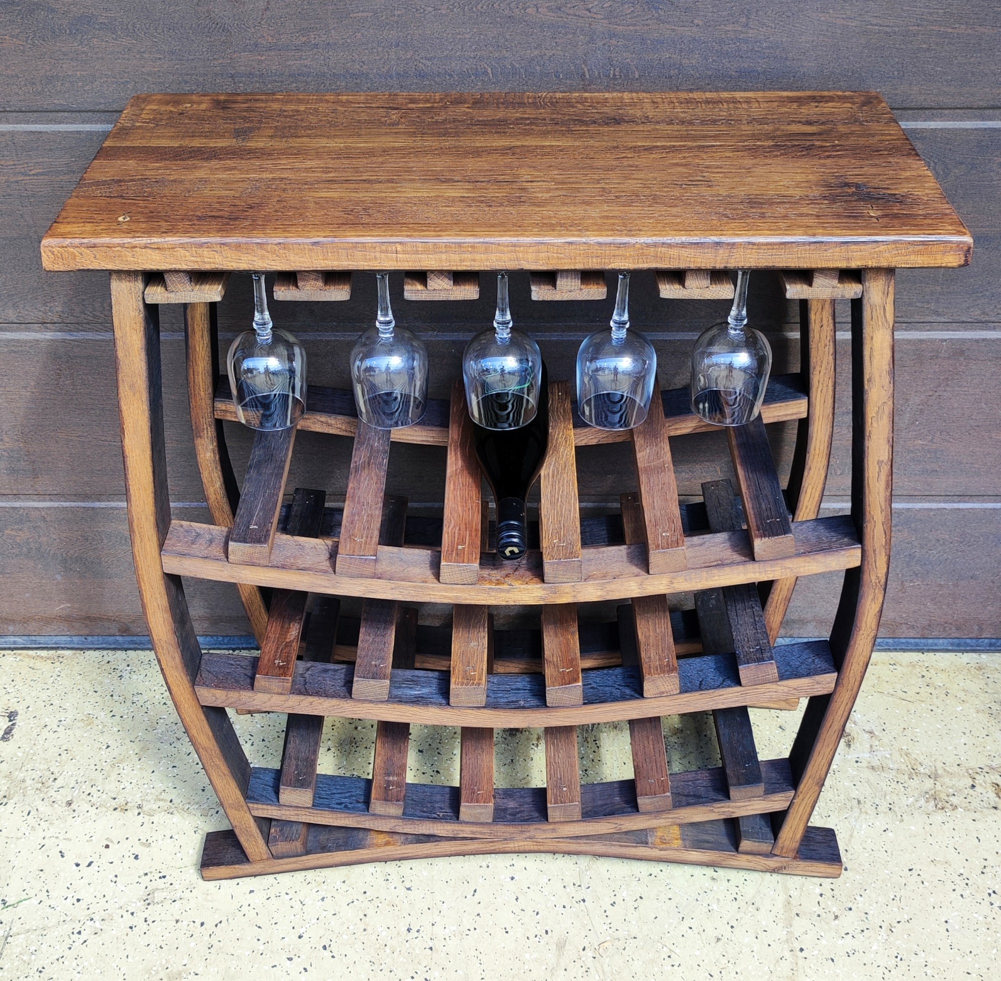Rustic, free-standing stand made of oak wine barrels, treated with rosewood glaze